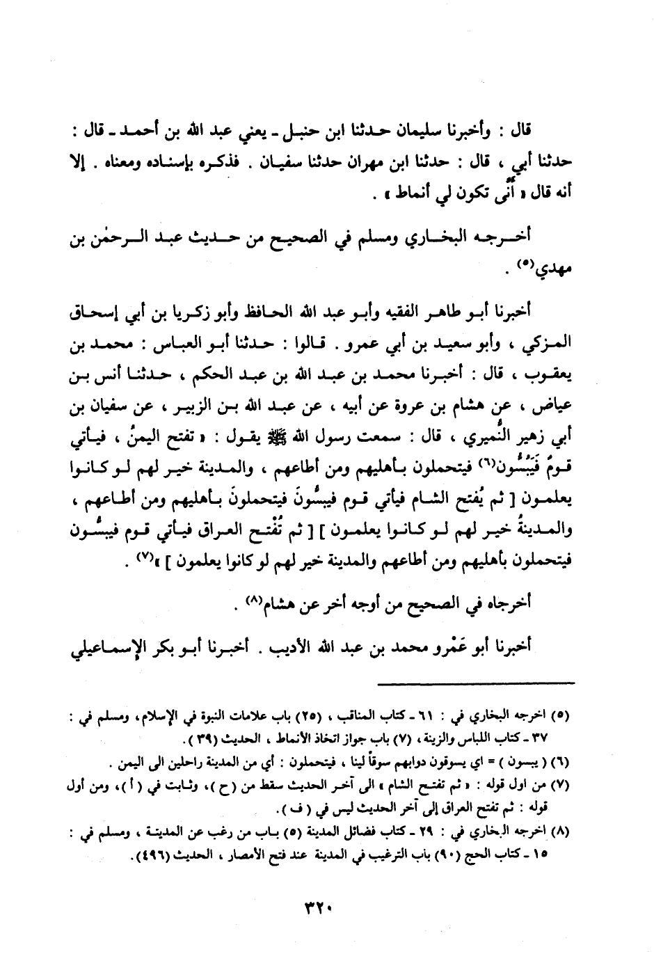 أَخْبَرَنَا أَبُو طَاهِرٍ الْفَقِيهُ وَأَبُو عَبْدِ اللهِ الْحَافِظُ وَأَبُو زَكَرِيَّا بْنُ أَبِي إِسْحَاقَ الْمُزَكِّي، وَأَبُو سَعِيدِ بْنُ أَبِي عَمْرٍو. قَالُوا: حَدَّثَنَا أَبُو الْعَبَّاسِ: مُحَمَّدُ بْنُ يَعْقُوبَ، قَالَ: أَخْبَرَنَا مُحَمَّدُ بْنُ عَبْدِ اللهِ بْنِ عَبْدِ الْحَكَمِ، حَدَّثَنَا أَنَسُ بْنُ عِيَاضٍ، عَنْ هِشَامِ بْنِ عُرْوَةَ عَنْ أَبِيهِ، عَنْ عَبْدِ اللهِ بْنِ الزُّبَيْرِ، عَنْ سُفْيَانَ بْنِ أَبِي زُهَيْرٍ النُّمَيْرِيِّ، قَالَ: سَمِعْتُ رَسُولَ اللهِ صَلَّى اللهُ عَلَيْهِ وَسَلَّمَ يَقُولُ: «تُفْتَحُ الْيَمَنُ، فَيَأْتِي قَوْمٌ فَيَبُسُّونَ [ (6) ] فَيَتَحَمَّلُونَ بِأَهْلِيهِمْ وَمَنْ أَطَاعَهُمْ، وَالْمَدِينَةُ خَيْرٌ لَهُمْ لَوْ كَانُوا يَعْلَمُونَ [ثُمَّ يُفْتَحُ الشَّامُ فَيَأْتِي قَوْمٌ فَيَبُسُّونَ فَيَتَحَمَّلُونَ بِأَهْلِيهِمْ وَمَنْ أَطَاعَهُمْ، وَالْمَدِينَةُ خَيْرٌ لَهُمْ لَوْ كَانُوا يَعْلَمُونَ] [ثُمَّ تُفْتَحُ الْعِرَاقُ فَيَأْتِي قَوْمٌ فَيَبُسُّونَ فَيَتَحَمَّلُونَ بِأَهْلِيهِمْ وَمَنْ أَطَاعَهُمْ وَالْمَدِينَةُ خَيْرٌ لَهُمْ لَوْ كَانُوا يَعْلَمُونَ] » [ (7) ] .