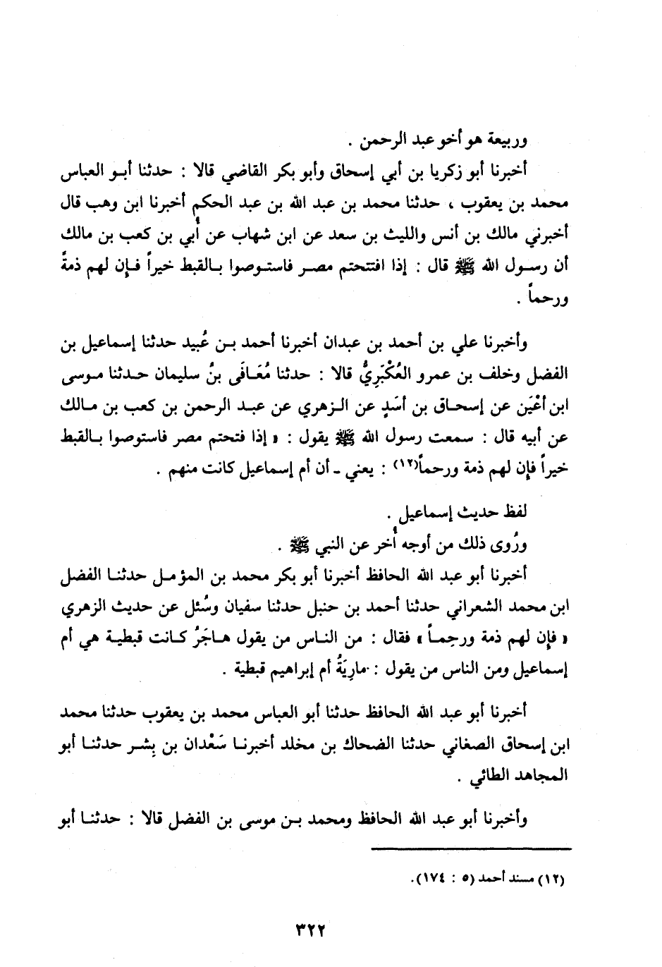 أَخْبَرَنَا أَبُو عَبْدِ اللهِ الْحَافِظُ أَخْبَرَنَا أَبُو بَكْرٍ مُحَمَّدُ بْنُ الْمُؤَمَّلِ حَدَّثَنَا الْفَضْلُ ابن مُحَمَّدٍ الشَّعْرَانِيُّ حَدَّثَنَا أَحْمَدُ بْنُ حَنْبَلٍ حَدَّثَنَا سُفْيَانُ وَسُئِلَ عَنِ حَدِيثِ الزُّهْرِيِّ «فَإِنَّ لَهُمْ ذِمَّةً وَرَحِمًا» فَقَالَ: مِنَ النَّاسِ مَنْ يَقُولُ هَاجَرُ كَانَتْ قِبْطِيَّةً هِيَ أُمُّ إِسْمَاعِيلَ وَمِنَ النَّاسِ مَنْ يَقُولُ: مَارِيَةُ أُمُّ إِبْرَاهِيمَ قِبْطِيَّةٌ.