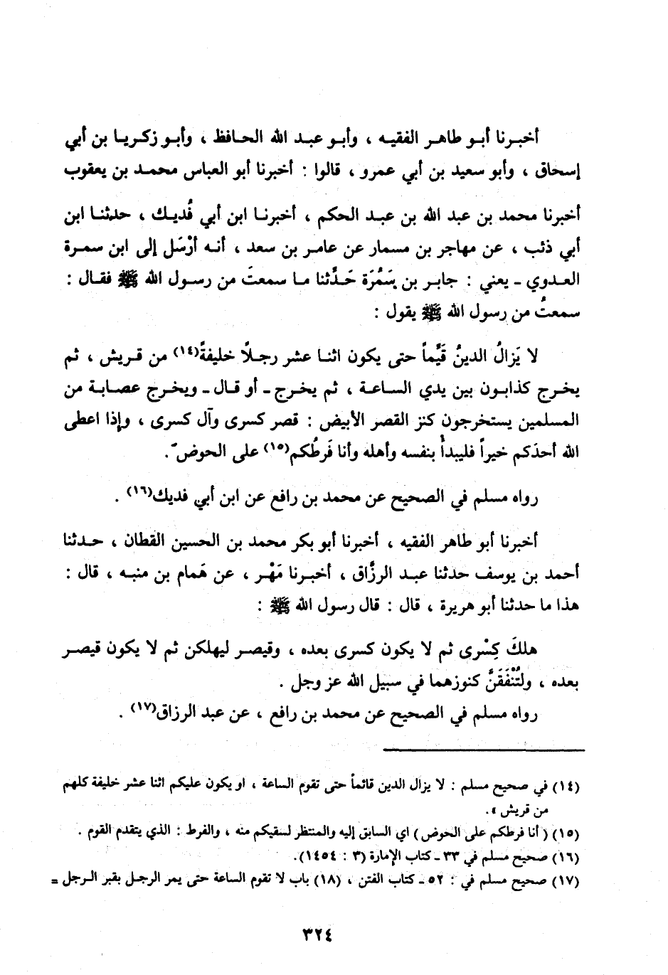 [ (14) ] في صحيح مسلم: لا يزال الدين قائما حتى تقوم الساعة، او يَكُونَ عَلَيْكُمُ اثْنَا عَشَرَ خَلِيفَةً كُلُّهُمْ مِنْ قُرَيْشٍ» .