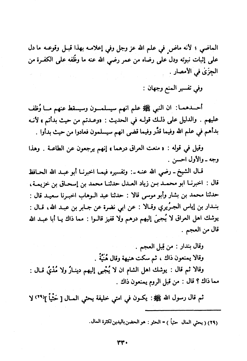 بُنْدَارُ بْنُ إِيَاسٍ الْجُرَيْرِيُّ وَقَالَا: عَنْ أَبِي نَضْرَةَ عَنْ جَابِرِ بْنِ عَبْدِ اللهِ، قَالَ: يُوشِكُ أَهْلُ الْعِرَاقِ لَا يُجْبَى إِلَيْهِمْ دِرْهَمٌ وَلَا قَفِيزٌ قَالُوا: مِمَّا ذَاكَ يَا أَبَا عَبْدِ اللهِ قَالَ مِنَ الْعَجَمِ.