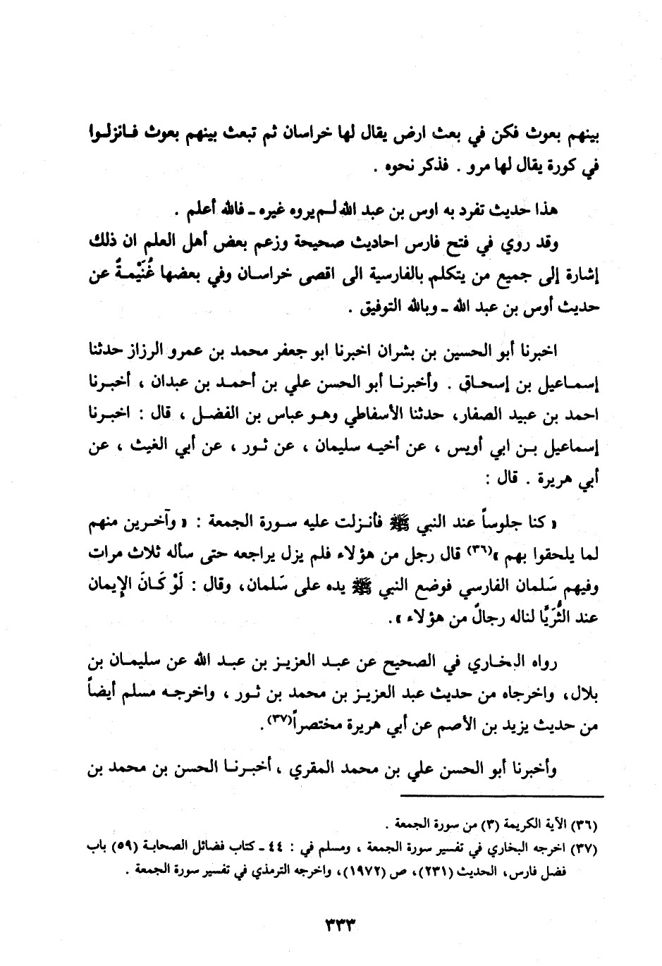 [ (37) ] أخرجه البخاري في تفسير سورة الجمعة، ومسلم فِي: 44- كِتَابِ فَضَائِلِ الصَّحَابَةِ (59) باب فضل فارس، الحديث (231) ، ص (1972) ، وأخرجه الترمذي في تفسير سورة الجمعة.
