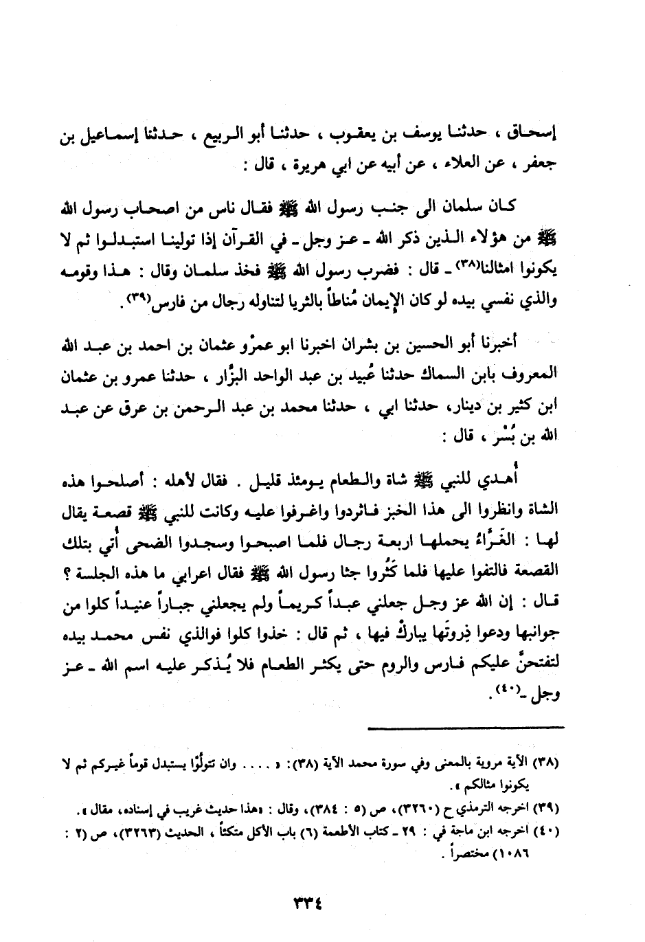 إِسْحَاقَ، حَدَّثَنَا يُوسُفُ بْنُ يَعْقُوبَ، حَدَّثَنَا أَبُو الرَّبِيعِ، حَدَّثَنَا إِسْمَاعِيلُ بْنُ جَعْفَرٍ، عَنِ الْعَلَاءِ، عَنْ أَبِيهِ عَنْ أَبِي هُرَيْرَةَ، قَالَ: كَانَ سَلْمَانُ إِلَى جَنْبِ رَسُولِ اللهِ صَلَّى اللهُ عَلَيْهِ وَسَلَّمَ فَقَالَ نَاسٌ مِنْ أَصْحَابِ رَسُولِ اللهِ صَلَّى اللهُ عَلَيْهِ وسلم مَنْ هَؤُلَاءِ الَّذِينَ ذَكَرَ اللهُ- عَزَّ وَجَلَّ- فِي الْقُرْآنِ إِذَا تَوَلَّيْنَا اسْتُبْدِلُوا ثُمَّ لَا يَكُونُوا أَمْثَالَنَا [ (38) ]- قَالَ: فَضَرَبَ رَسُولُ اللهِ صَلَّى الله عليه وسلم فَخِذَ سَلْمَانَ وَقَالَ: هَذَا وَقَوْمُهُ وَالَّذِي نَفْسِي بِيَدِهِ لَوْ كَانَ الْإِيمَانُ مُنَاطًا بِالثُّرَيَّا لَتَنَاوَلَهُ رِجَالٌ مِنْ فَارِسَ [ (39) ] .
