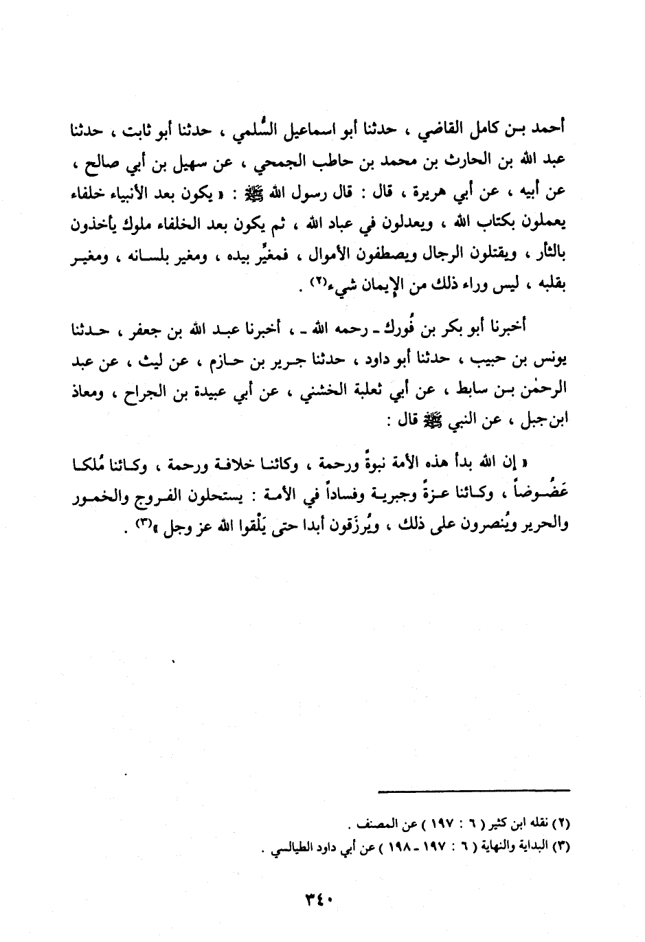 أَخْبَرَنَا أَبُو بَكْرِ بْنُ فُورَكٍ- رَحِمَهُ اللهُ-، أَخْبَرَنَا عَبْدُ اللهِ بْنُ جَعْفَرٍ، حَدَّثَنَا يُونُسُ بْنُ حَبِيبٍ، حَدَّثَنَا أَبُو دَاوُدَ، حَدَّثَنَا جَرِيرُ بْنُ حَازِمٍ، عَنْ لَيْثٍ، عَنْ عَبْدِ الرَّحْمَنِ بْنِ سَابِطٍ، عَنْ أَبِي ثَعْلَبَةَ الْخُشَنِيُّ، عَنْ أَبِي عُبَيْدَةَ بْنِ الْجَرَّاحِ، ومعاذ ابن جَبَلٍ، عَنِ النَّبِيِّ صَلَّى اللهُ عَلَيْهِ وَسَلَّمَ قَالَ: «إِنَّ اللهَ بَدَأَ هَذِهِ الْأُمَّةَ نُبُوَّةً وَرَحْمَةً، وَكَائِنًا خِلَافَةً وَرَحْمَةً، وَكَائِنًا مُلْكًا عضوضا، وكائنا عِزَّةً وَجَبْرِيَّةً وَفَسَادًا فِي الْأُمَّةِ: يَسْتَحِلُّونَ الْفُرُوجَ وَالْخُمُورَ وَالْحَرِيرَ وَيُنْصَرُونَ عَلَى ذَلِكَ، وَيُرْزَقُونَ أَبَدًا حَتَّى يَلْقَوَا الله عز وجل» [ (3) ] .