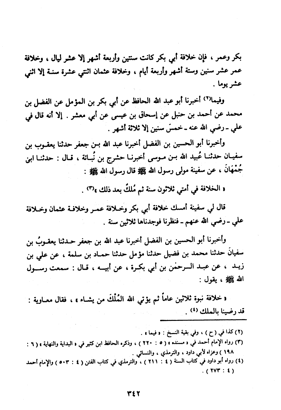 بَكْرٍ وَعُمَرَ، فَإِنَّ خِلَافَةَ أَبِي بَكْرٍ كَانَتْ سَنَتَيْنِ وَأَرْبَعَةَ أَشْهُرٍ إِلَّا عَشْرَ لَيَالٍ، وَخِلَافَةَ عُمَرَ عَشْرُ سِنِينَ وَسِتَّةُ أَشْهُرٍ وَأَرْبَعَةُ أَيَّامٍ، وَخِلَافَةَ عُثْمَانَ اثْنَتَيْ عَشْرَةَ سَنَةً إِلَّا اثْنَيْ عَشَرَ يَوْمًا.