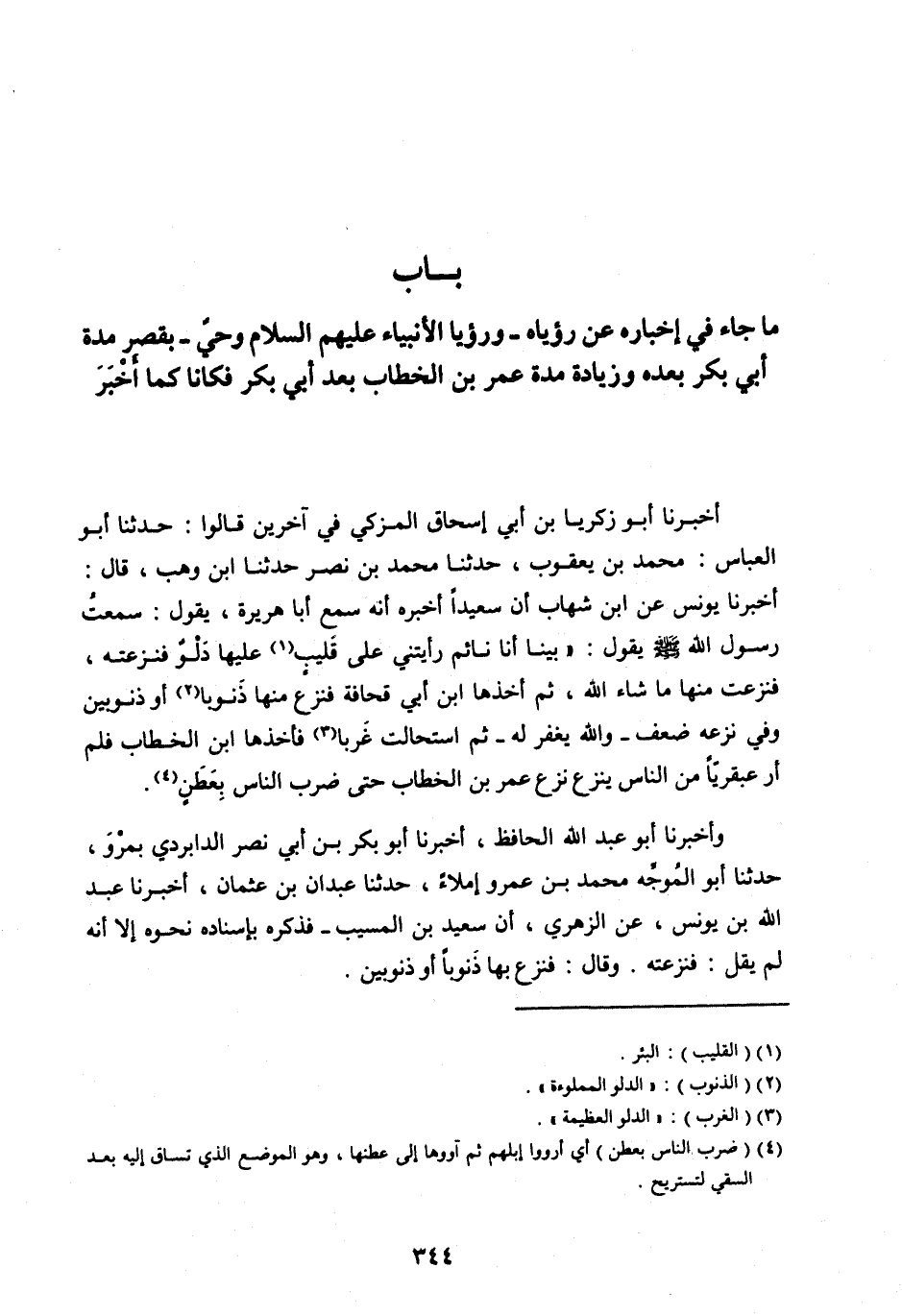 أَخْبَرَنَا يُونُسُ عَنِ ابْنِ شِهَابٍ أَنَّ سَعِيدًا أَخْبَرَهُ أَنَّهُ سَمِعَ أَبَا هُرَيْرَةَ، يَقُولُ: سَمِعْتُ رَسُولَ اللهِ صَلَّى اللهُ عَلَيْهِ وَسَلَّمَ يَقُولُ: «بَيْنَا أَنَا نَائِمٌ رَأَيْتُنِي عَلَى قَلِيبٍ [ (1) ] عَلَيْهَا دَلْوٌ فَنَزَعْتُهُ، فَنُزِعَتْ مِنْهَا مَا شَاءَ اللهُ، ثُمَّ أَخَذَهَا ابْنُ أَبِي قُحَافَةَ فَنَزَعَ مِنْهَا ذَنُوبًا [ (2) ] أَوْ ذَنُوبَيْنِ وَفِي نَزْعِهِ ضَعْفٌ- وَاللهُ يَغْفِرُ لَهُ- ثُمَّ اسْتَحَالَتْ غَرْبًا [ (3) ] فَأَخَذَهَا ابْنُ الْخَطَّابِ فَلَمْ أَرَ عَبْقَرِيًّا مِنَ النَّاسِ يَنْزِعُ نَزْعَ عُمَرَ بْنِ الْخَطَّابِ حَتَّى ضَرَبَ النَّاسَ بِعَطَنٍ [ (4) ] .