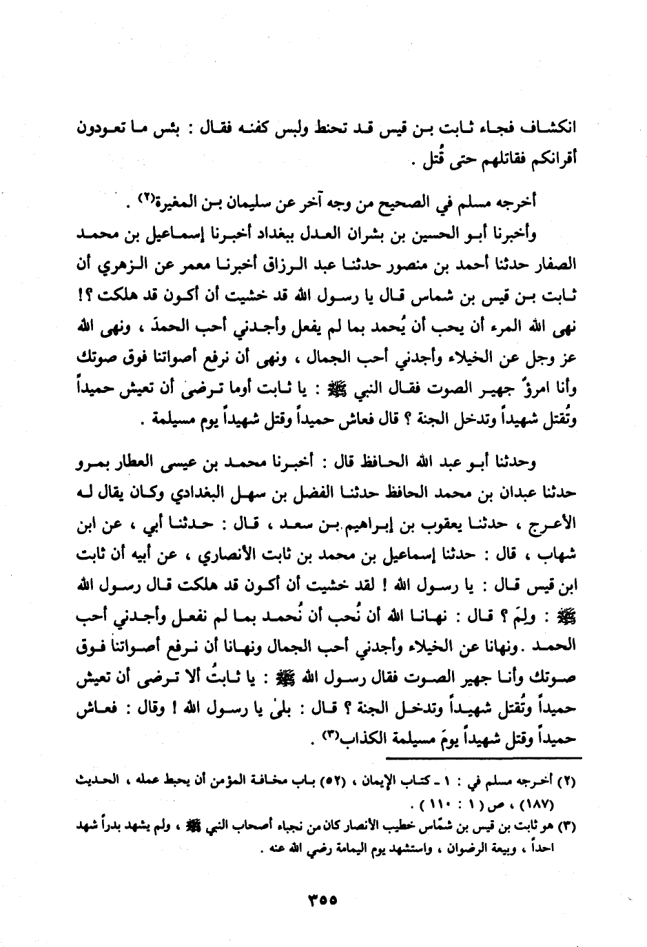 وحَدَّثَنَا أَبُو عَبْدِ اللهِ الْحَافِظُ قَالَ: أَخْبَرَنَا مُحَمَّدُ بْنُ عِيسَى الْعَطَّارُ بِمَرْوَ حَدَّثَنَا عَبْدَانُ بْنُ مُحَمَّدٍ الْحَافِظُ حَدَّثَنَا الْفَضْلُ بْنُ سَهْلٍ الْبَغْدَادِيُّ وَكَانَ يُقَالُ لَهُ الْأَعْرَجُ، حَدَّثَنَا يَعْقُوبُ بْنُ إِبْرَاهِيمَ بْنِ سَعْدٍ، قَالَ: حَدَّثَنَا أَبِي، عَنِ ابْنِ شِهَابٍ، قَالَ: حَدَّثَنَا إِسْمَاعِيلُ بْنُ مُحَمَّدِ بْنِ ثَابِتٍ الْأَنْصَارِيُّ، عَنْ أَبِيهِ أَنَّ ثَابِتَ ابن قَيْسٍ قَالَ: يَا رَسُولَ اللهِ! لَقَدْ خَشِيتُ أَنَّ أَكُونَ قَدْ هَلَكْتُ قَالَ رَسُولُ اللهِ صَلَّى اللهُ عَلَيْهِ وَسَلَّمَ: وَلَمْ؟ قَالَ: نَهَانَا اللهُ أَنْ نُحِبَّ أَنْ نُحْمَدَ بِمَا لَمْ نَفْعَلْ وَأَجِدُنِي أُحِبُّ الْحَمْدَ. وَنَهَانَا عَنِ الْخُيَلَاءِ وَأَجِدُنِي أُحِبُّ الْجَمَالَ وَنَهَانَا أَنْ نَرْفَعَ أَصْوَاتَنَا فَوْقَ صَوْتِكَ وَأَنَا جَهِيرُ الصَّوْتِ فَقَالَ رَسُولُ اللهِ صَلَّى اللهُ عَلَيْهِ وَسَلَّمَ: يَا ثَابِتُ أَلَا تَرْضَى أَنْ تَعِيشَ حَمِيدًا وَتُقْتَلَ شَهِيدًا وَتَدْخُلَ الْجَنَّةَ؟ قَالَ: بَلَى يَا رَسُولَ اللهِ! وَقَالَ: فَعَاشَ حَمِيدًا وَقُتِلَ شَهِيدًا يَوْمَ مسيلمة الكذاب [ (3) ] .