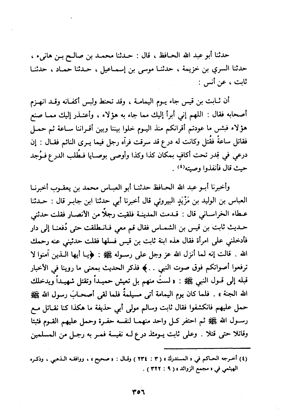 أَنَّ ثَابِتَ بْنَ قَيْسٍ جَاءَ يَوْمَ الْيَمَامَةِ، وَقَدْ تَحَنَّطَ وَلَبِسَ أَكْفَانَهُ وَقَدِ انْهَزَمَ أَصْحَابُهُ فَقَالَ: اللهُمَّ إِنِّي أَبْرَأُ إِلَيْكَ مِمَّا جَاءَ بِهِ هَؤُلَاءِ، وَأَعْتَذِرُ إِلَيْكَ مِمَّا صَنَعَ هَؤُلَاءِ فَبِئْسَ مَا عَوَّدْتُمْ أَقْرَانَكُمْ مُنْذُ الْيَوْمِ خَلُّوا بَيْنَنَا وَبَيْنَ أَقْرَانِنَا سَاعَةً ثُمَّ حَمَلَ فَقَاتَلَ سَاعَةً فَقُتِلَ وَكَانَتْ لَهُ دِرْعٌ قَدْ سُرِقَتْ فَرَآهُ رَجُلٌ فِيمَا يَرَى النَّائِمُ فَقَالَ: إِنَّ دِرْعِي فِي قِدْرٍ تَحْتَ إِكَافٍ بِمَكَانِ كَذَا وَكَذَا وَأَوْصَى بِوَصَايَا فَطَلَبَ الدِّرْعَ فَوَجَدَ حَيْثُ قَالَ فَأَنْفَذُوا وَصِيَّتَهُ [ (4) ] .