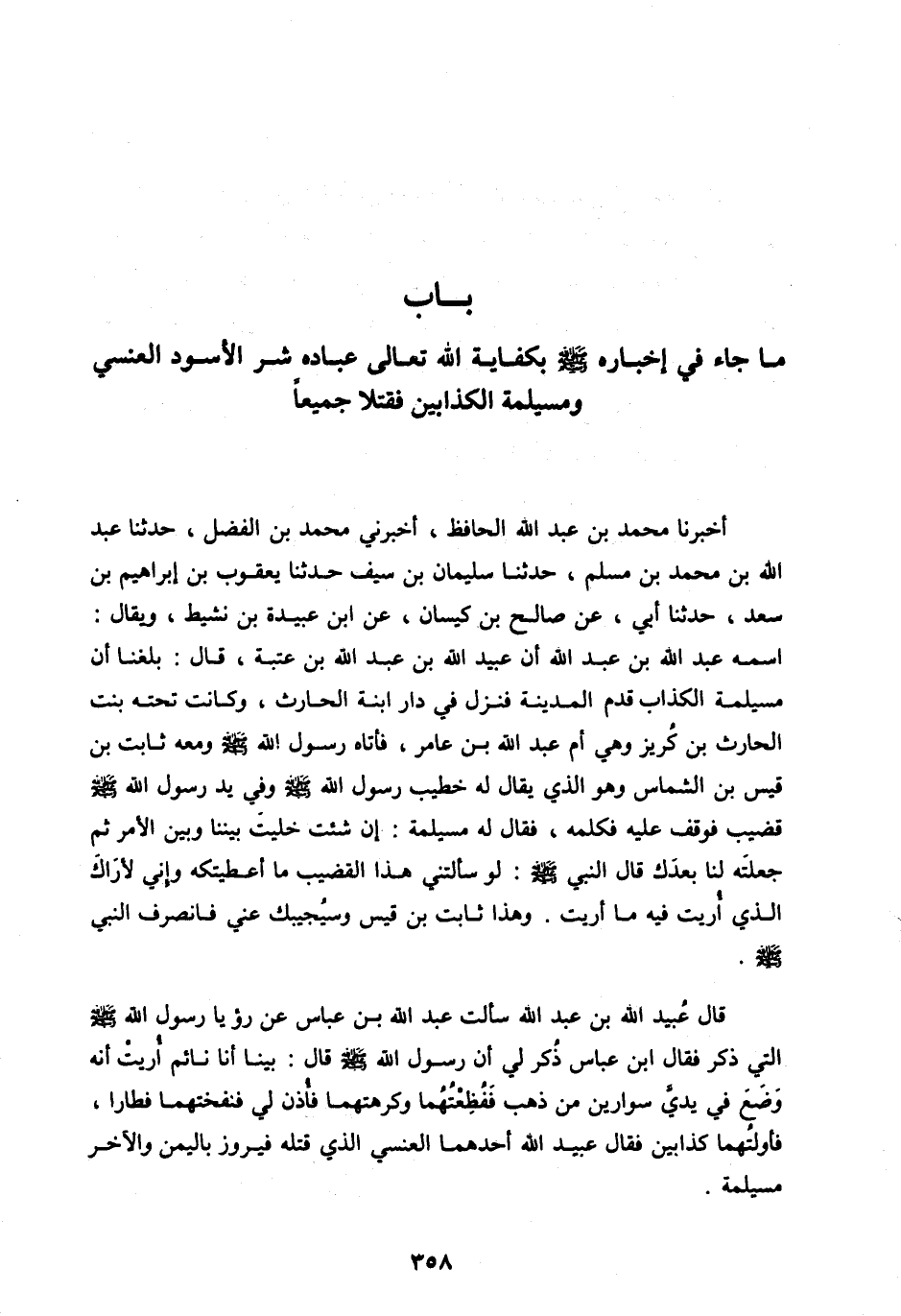 بَابُ مَا جَاءَ فِي إِخْبَارِهِ صَلَّى اللهُ عَلَيْهِ وَسَلَّمَ بِكِفَايَةِ اللهِ تَعَالَى عِبَادَهُ شَرَّ الْأَسْوَدِ الْعَنْسِيِّ وَمُسَيْلِمَةَ الْكَذَّابَيْنِ فَقُتِلَا جَمِيعًا