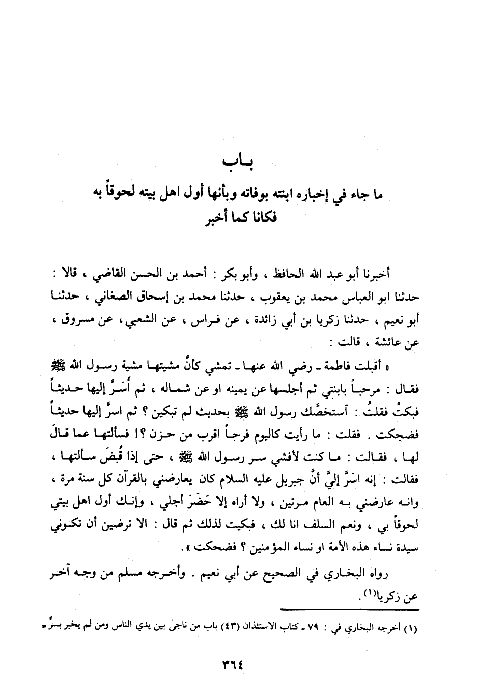 حَدَّثَنَا أَبُو الْعَبَّاسِ مُحَمَّدُ بْنُ يَعْقُوبَ، حَدَّثَنَا مُحَمَّدُ بْنُ إِسْحَاقَ الصَّغَانِيُّ، حَدَّثَنَا أَبُو نُعَيْمٍ، حَدَّثَنَا زَكَرِيَّا بْنُ أَبِي زَائِدَةَ، عَنْ فِرَاسٍ، عَنِ الشَّعْبِيِّ، عَنْ مَسْرُوقٍ، عَنْ عَائِشَةَ، قَالَتْ: «أَقْبَلَتْ فَاطِمَةُ- رَضِيَ اللهُ عَنْهَا- تَمْشِي كَأَنَّ مِشْيَتَهَا مِشْيَةِ رَسُولِ اللهِ صَلَّى اللهُ عَلَيْهِ وَسَلَّمَ فَقَالَ: مَرْحَبًا بِابْنَتِي ثُمَّ أَجْلَسَهَا عَنْ يَمِينِهِ أَوْ عَنْ شِمَالِهِ، ثُمَّ أَسَرَّ إِلَيْهَا حَدِيثًا فَبَكَتْ فَقُلْتُ: اسْتَخَصَّكِ رَسُولُ اللهِ صَلَّى اللهُ عَلَيْهِ وَسَلَّمَ بِحَدِيثٍ لِمَ تَبْكِينْ؟ ثُمَّ أَسَرَّ إِلَيْهَا حَدِيثًا فَضَحِكَتْ. فَقُلْتُ: مَا رَأَيْتُ كَالْيَوْمِ فَرَحًا أَقْرَبُ مِنْ حَزَنٍ؟! فَسَأَلْتُهَا عَمَّا قَالَ لَهَا، فَقَالَتْ: مَا كُنْتُ لِأُفْشِيَ سِرَّ رَسُولِ اللهِ صَلَّى اللهُ عَلَيْهِ وَسَلَّمَ، حَتَّى إِذَا قُبِضَ سَأَلْتُهَا، فَقَالَتْ: إِنَّهُ أَسَرَّ إِلَيَّ أَنَّ جِبْرِيلَ عَلَيْهِ السَّلَامُ كَانَ يُعَارِضُنِي بِالْقُرْآنِ كل سنة مرة، وأنه عَارَضَنِي بِهِ الْعَامَ مَرَّتَيْنِ، وَلَا أُرَاهُ إِلَّا حَضَرَ أَجْلِي، وَإِنَّكَ أَوَّلُ أَهْلِ بَيْتِي لُحُوقًا بِي، وَنِعْمَ السَّلَفُ أَنَا لَكِ، فَبَكَيْتُ لِذَلِكَ ثُمَّ قَالَ: أَلَا تَرْضَيْنَ أَنْ تَكُونِي سَيِّدَةَ نِسَاءِ هَذِهِ الْأُمَّةِ أَوْ نِسَاءِ الْمُؤْمِنِينَ؟ فَضَحِكْتُ» .