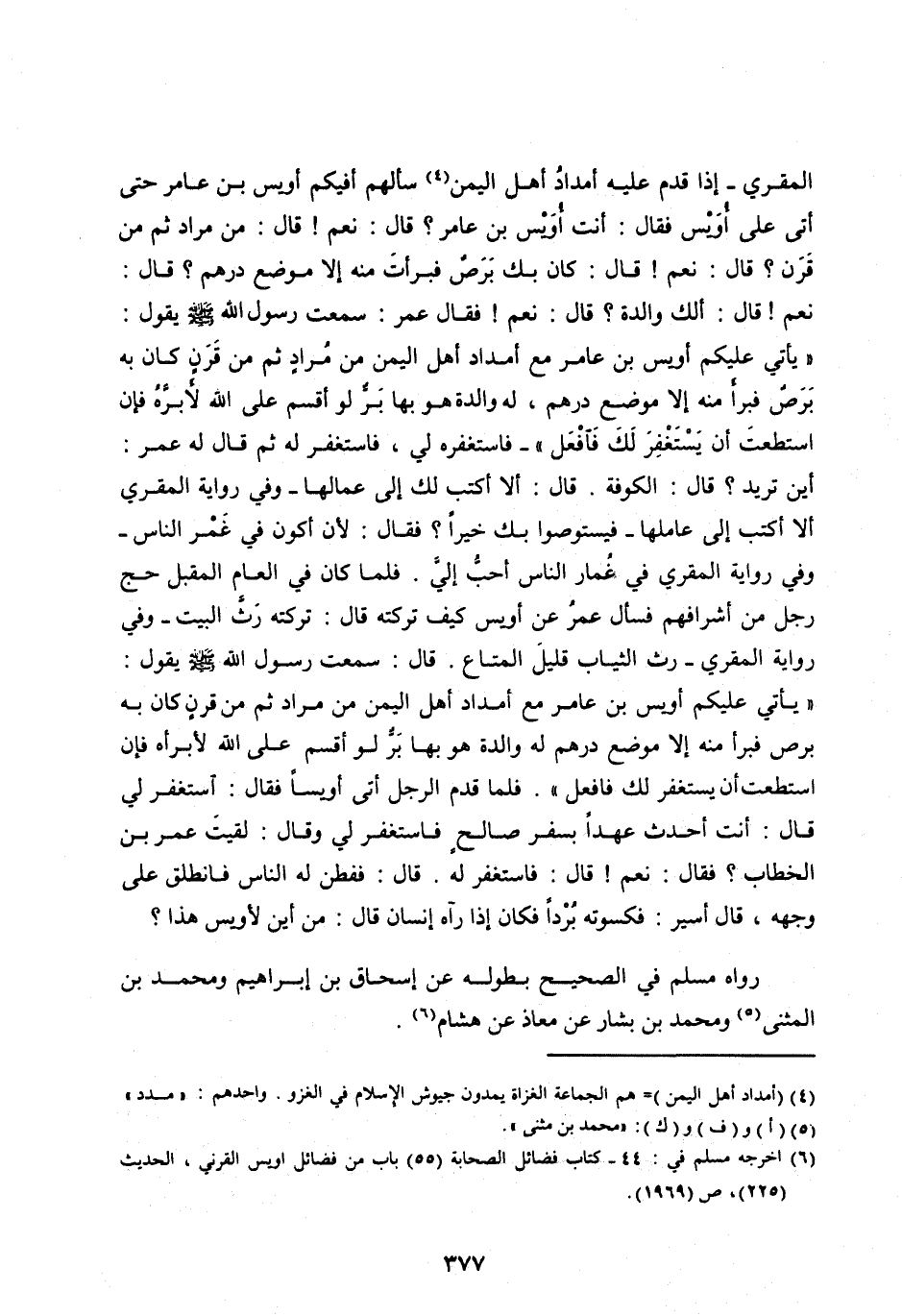 «يَأْتِي عَلَيْكُمْ أُوَيْسُ بْنُ عَامِرٍ مَعَ أَمْدَادِ أَهْلِ الْيَمَنِ مِنْ مُرَادٍ ثُمَّ مِنْ قَرَنٍ كَانَ بِهِ بَرَصٌ فَبَرَأَ مِنْهُ إِلَّا مَوْضِعَ دِرْهَمٍ لَهُ وَالِدَةٌ هُوَ بِهَا بَرٌّ لَوْ أَقْسَمَ عَلَى اللهِ لأبرأه فَإِنِ اسْتَطَعْتَ أَنْ يَسْتَغْفِرَ لَكَ فَافْعَلْ» . فَلَمَّا قَدِمَ الرَّجُلُ أَتَى أُوَيْسًا فَقَالَ: اسْتَغْفِرْ لِي قَالَ: أَنْتَ أَحْدَثُ عَهْدًا بِسَفَرٍ صَالِحٍ فَاسْتَغْفَرَ لِي وَقَالَ: لَقِيتَ عُمَرَ بْنَ الْخَطَّابِ؟ فَقَالَ: نَعَمْ! قَالَ: فَاسْتَغْفَرَ لَهُ. قَالَ: فَفَطِنَ لَهُ النَّاسُ فَانْطَلَقَ عَلَى وَجْهِهِ، قَالَ أُسَيْرٌ: فَكَسَوْتُهُ بُرْدًا فَكَانَ إِذَا رَآهُ إِنْسَانٌ قَالَ: مِنْ أَيْنَ لِأُوَيْسٍ هَذَا؟