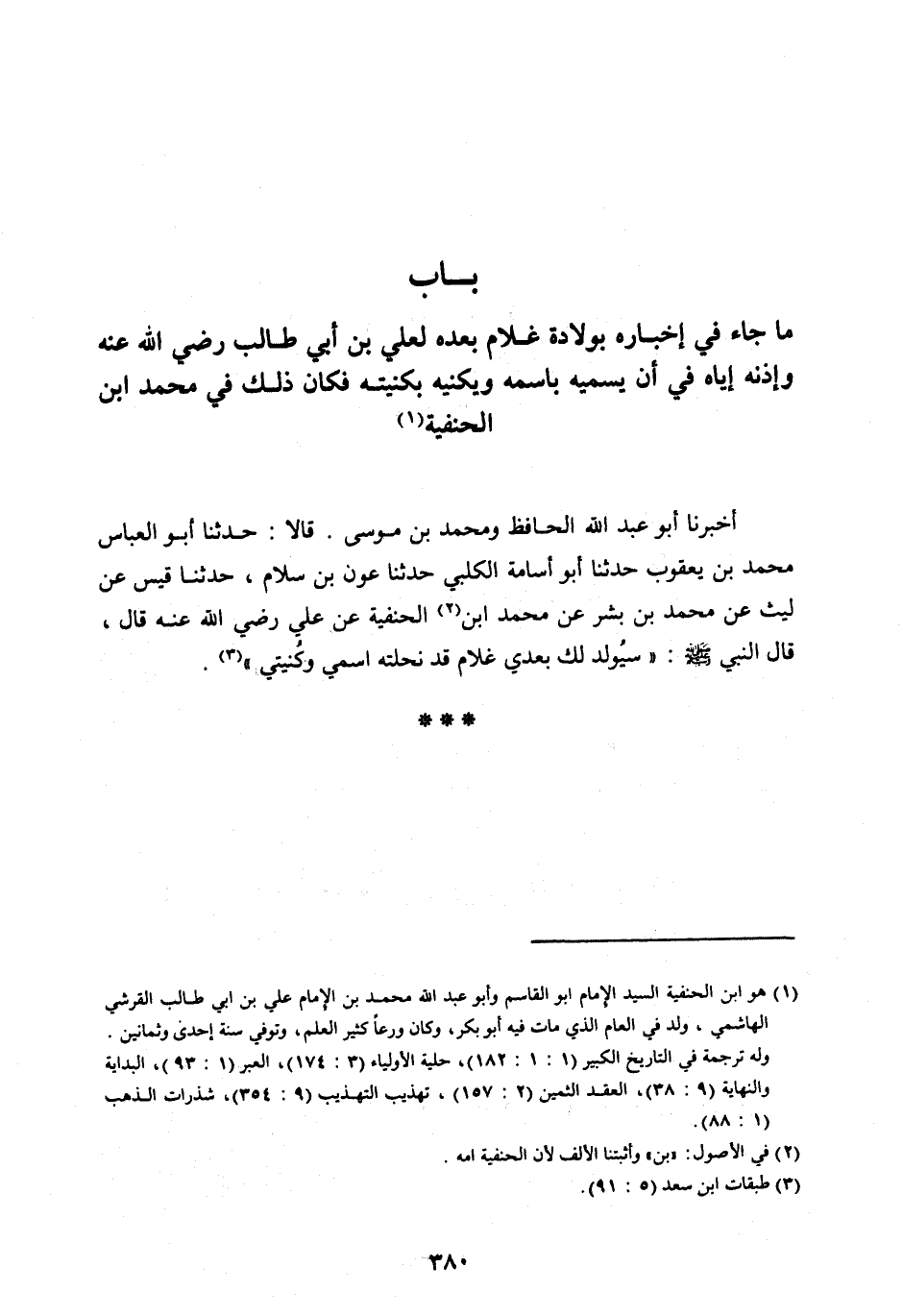 بَابُ مَا جَاءَ فِي إِخْبَارِهِ بِوِلَادَةِ غُلَامٍ بَعْدَهُ لِعَلِيِّ بْنِ أَبِي طَالِبٍ رَضِيَ اللهُ عَنْهُ وَإِذْنِهِ إِيَّاهُ فِي أَنْ يُسَمِّيَهُ بِاسْمِهِ وَيُكْنِيَهُ بِكُنْيَتِهِ فَكَانَ ذَلِكَ فِي مُحَمَّدِ ابْنِ الْحَنَفِيَّةِ [ (1) ]