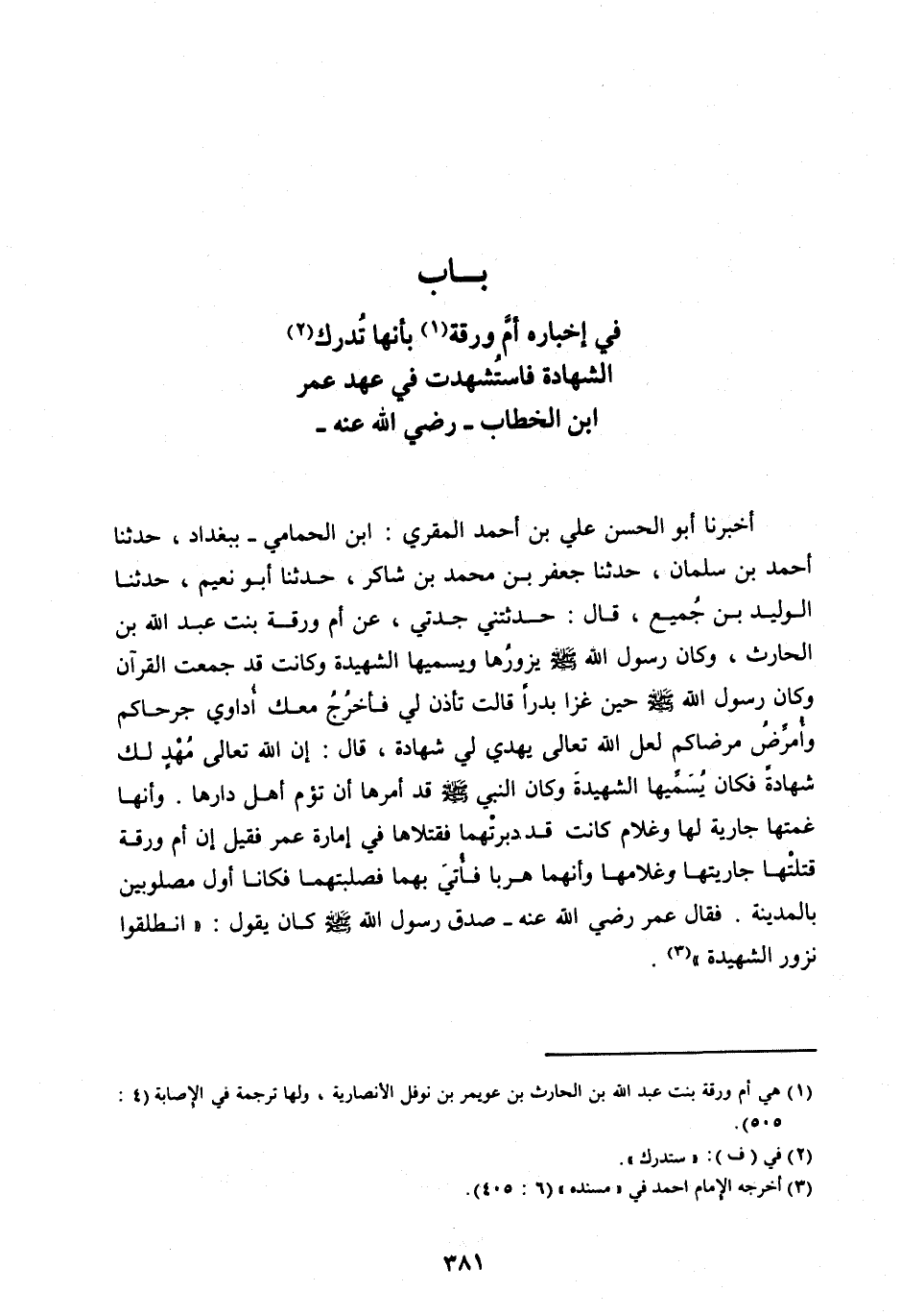 أَخْبَرَنَا أَبُو الْحَسَنِ عَلِيُّ بن أحمد المقري: ابْنُ الْحَمَامِيِّ- بِبَغْدَادَ، حَدَّثَنَا أَحْمَدُ بْنُ سَلْمَانَ، حَدَّثَنَا جَعْفَرُ بْنُ مُحَمَّدِ بْنِ شَاكِرٍ، حَدَّثَنَا أَبُو نُعَيْمٍ، حَدَّثَنَا الْوَلِيدُ بْنُ جُمَيْعٍ، قَالَ: حَدَّثَتْنِي جَدَّتِي، عَنْ أُمِّ وَرَقَةَ بِنْتِ عَبْدِ اللهِ بْنِ الْحَارِثِ، وَكَانَ رَسُولُ اللهِ صَلَّى الله عَلَيْهِ وَسَلَّمَ يَزُورُهَا وَيُسَمِّيهَا الشَّهِيدَةَ وَكَانَتْ قَدْ جَمَعَتِ الْقُرْآنَ وَكَانَ رَسُولُ اللهِ صَلَّى اللهُ عَلَيْهِ وَسَلَّمَ حِينَ غَزَا بَدْرًا قَالَتْ تَأْذَنُ لِي فَأَخْرُجُ مَعَكَ أُدَاوِي جَرْحَاكُمْ وَأُمَرِّضُ مَرْضَاكُمْ لَعَلَّ اللهَ تَعَالَى يُهْدِي لِي شَهَادَةً، قَالَ: إِنَّ اللهَ تَعَالَى مُهْدٍ لَكِ شَهَادَةً فَكَانَ يُسَمِّيهَا الشَّهِيدَةَ وَكَانَ النَّبِيُّ صَلَّى اللهُ عَلَيْهِ وَسَلَّمَ قَدْ أَمَرَهَا أَنْ تَؤُمَّ أَهْلَ دَارِهَا. وَأَنَّهَا غَمَّتْهَا جَارِيَةٌ لَهَا وَغُلَامٌ كَانَتْ قَدْ دَبَّرَتْهُمَا فَقَتَلَاهَا فِي إِمَارَةِ عُمَرَ فَقِيلَ إِنَّ أُمَّ وَرَقَةَ قَتَلَتْهَا جَارِيَتُهَا وَغُلَامُهَا وَأَنَّهُمَا هَرَبَا فَأُتِيَ بِهِمَا فَصَلَبْتُهُمَا فَكَانَا أَوَّلَ مَصْلُوبَيْنِ بِالْمَدِينَةَ. فَقَالَ عُمَرُ رَضِيَ اللهُ عَنْهُ- صَدَقَ رَسُولُ اللهِ صَلَّى اللهُ عَلَيْهِ وَسَلَّمَ كَانَ يَقُولُ: «انْطَلِقُوا نَزُورُ الشهيدة» [ (3) ] .