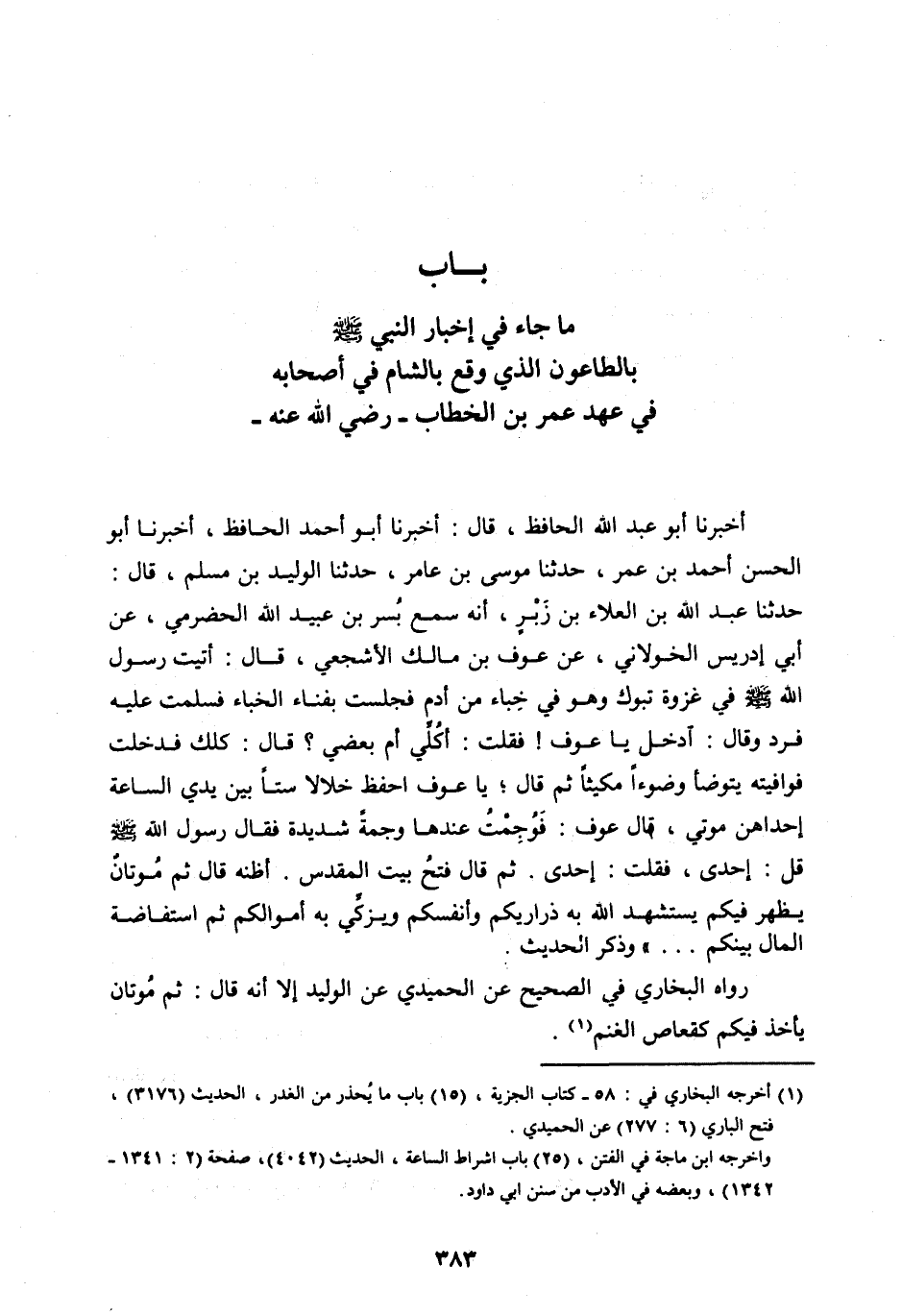 رَوَاهُ الْبُخَارِيُّ فِي الصَّحِيحِ عَنِ الْحُمَيْدِيِّ عَنِ الْوَلِيدِ إِلَّا أَنَّهُ قَالَ: ثُمَّ مُوتَانٌ يَأْخُذُ فيكم كقعاص الغنم [ (1) ] .