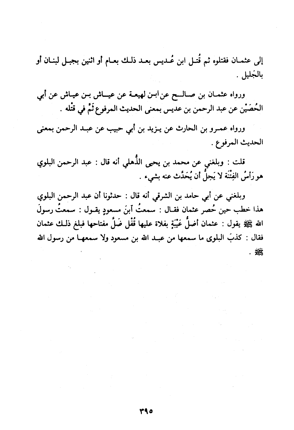 وَبَلَغَنِي عَنْ أَبِي حَامِدِ بْنِ الشَّرْقِيِّ أَنَّهُ قَالَ: حَدَّثُونَا أَنَّ عَبْدَ الرَّحْمَنِ الْبَلَوِيَّ هَذَا خَطَبَ حِينَ حُصِرَ عُثْمَانُ فَقَالَ: سَمِعْتُ ابْنَ مَسْعُودٍ يَقُولُ: سَمِعْتُ رَسُولَ اللهِ صَلَّى اللهُ عَلَيْهِ وَسَلَّمَ يَقُولُ: عُثْمَانُ أَضَلُّ عَيْبَةٍ بِفَلَاةٍ عَلَيْهَا قُفْلٌ ضَلَّ مِفْتَاحُهَا فَبَلَغَ ذَلِكَ عُثْمَانُ فَقَالَ: كَذَبَ الْبَلَوِيُّ مَا سَمِعَهَا مِنْ عَبْدِ اللهِ بْنِ مَسْعُودٍ وَلَا سَمِعَهَا مِنْ رَسُولِ اللهِ صَلَّى اللهُ عَلَيْهِ وَسَلَّمَ.