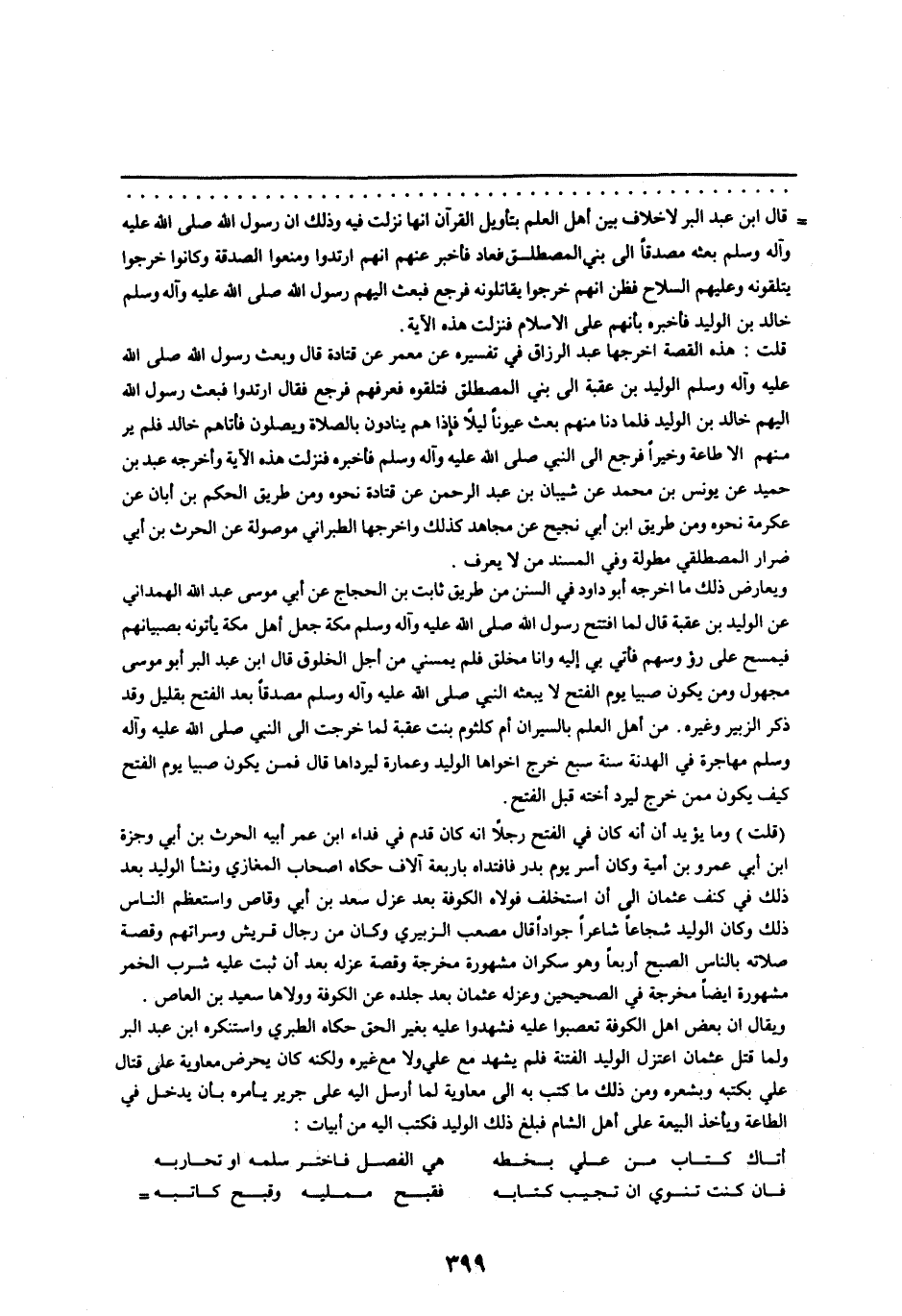 [ () ] قال ابن عبد البر لا خلاف بين أهل العلم بتأويل القرآن انها نزلت فيه وذلك ان رسول الله صلى الله عليه وآله وسلم بعثه مصدقا الى بني المصطلق فعاد فأخبر عنهم انهم ارتدوا ومنعوا الصدقة وكانوا خرجوا يتلقونه وعليهم السلاح فظن انهم خرجوا يقاتلونه فرجع فبعث إليهم رسول الله صلى الله عليه وآله وسلم خالد بن الوليد فأخبره بأنهم على الإسلام فنزلت هذه الآية.