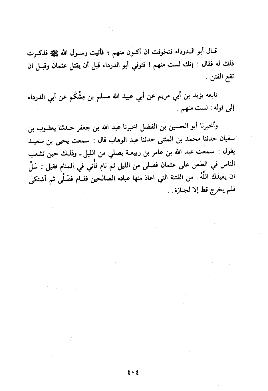 قَالَ أَبُو الدَّرْدَاءِ فَتَخَوَّفْتُ أَنْ أَكُونَ مِنْهُمْ، فَأَتَيْتُ رَسُولَ اللهِ صَلَّى الله عَلَيْهِ وَسَلَّمَ فَذَكَرْتُ ذَلِكَ لَهُ فَقَالَ: إِنَّكَ لَسْتَ مِنْهُمْ! فَتُوُفِّيَ أَبُو الدَّرْدَاءِ قَبْلَ أَنْ يُقْتَلَ عُثْمَانُ وَقَبْلَ أَنْ تَقَعَ الْفِتَنُ.