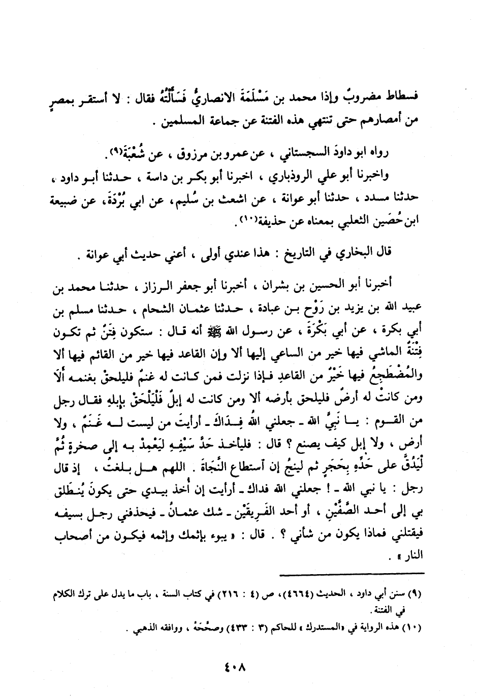 [ (9) ] سنن أبي داود، الحديث (4664) ، ص (4: 216) في كتاب السنة، باب ما يدل على ترك الكلام في الفتنة.