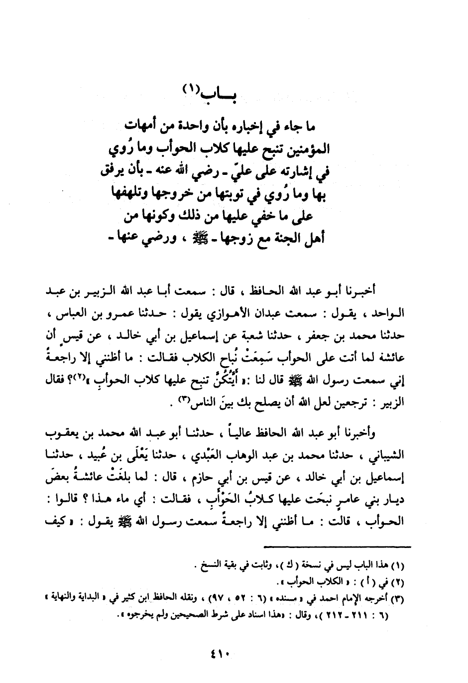 بَابُ [ (1) ] مَا جَاءَ فِي إِخْبَارِهِ بِأَنَّ وَاحِدَةً مِنْ أُمَّهَاتِ الْمُؤْمِنِينَ تَنْبَحُ عَلَيْهَا كِلَابُ الْحَوْأَبِ وَمَا رُوِيَ فِي إِشَارَتِهِ عَلَى عَلِيٍّ- رَضِيَ اللهُ عَنْهُ- بِأَنْ يَرْفُقَ بِهَا وَمَا رُوِيَ فِي تَوْبَتِهَا مِنْ خُرُوجِهَا وَتَلَهُّفِهَا عَلَى مَا خَفِيَ عَلَيْهَا مِنْ ذَلِكَ وَكَوْنِهَا مِنْ أَهْلِ الْجَنَّةِ مَعَ زَوْجِهَا- صَلَّى اللهُ عَلَيْهِ وَسَلَّمَ، وَرَضِيَ عَنْهَا-