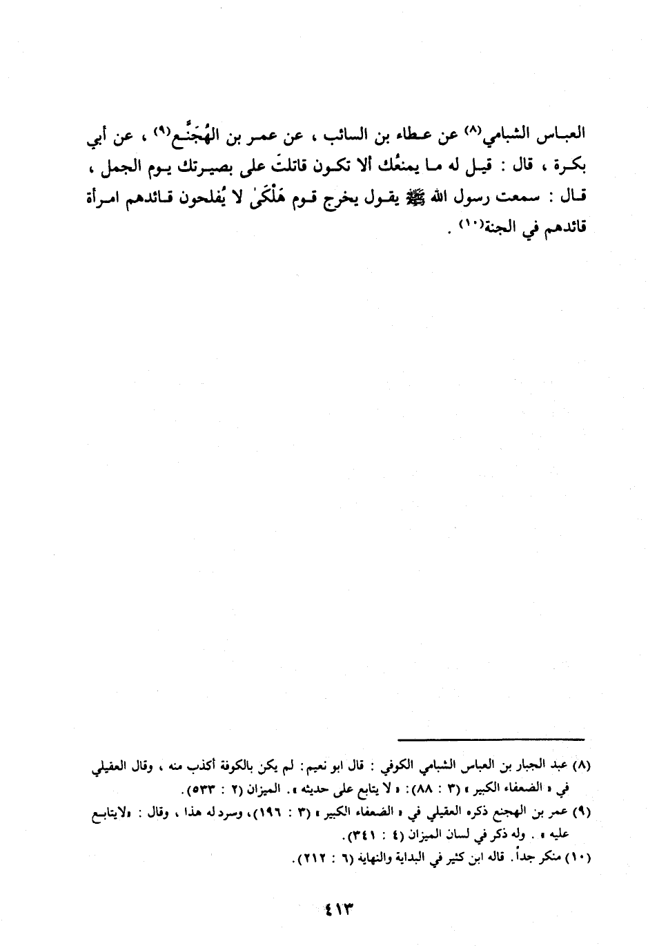 الْعَبَّاسِ الشِّبَامِيُّ [ (8) ] عَنْ عَطَاءِ بْنِ السَّائِبِ، عَنْ عُمَرَ بْنِ الْهُجَنَّعِ [ (9) ] ، عَنْ أَبِي بَكَرَةَ، قَالَ: قِيلَ لَهُ مَا يَمْنَعُكَ أَلَّا تَكُونَ قَاتَلْتَ عَلَى بَصِيرَتِكَ يَوْمَ الْجَمَلِ، قَالَ: سَمِعْتُ رَسُولَ اللهِ صَلَّى اللهُ عَلَيْهِ وَسَلَّمَ يَقُولُ يَخْرُجُ قَوْمٌ هَلْكَى لَا يُفْلِحُونَ قَائِدُهُمُ امْرَأَةٌ قَائِدُهُمْ فِي الْجَنَّةِ [ (10) ] .