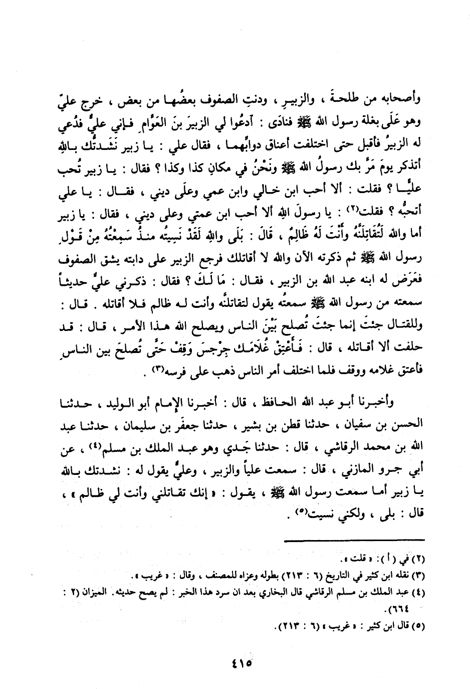 وَأَصْحَابُهُ مِنْ طَلْحَةَ، وَالزُّبَيْرِ، وَدَنَتِ الصُّفُوفُ بَعْضُهَا مِنْ بَعْضٍ، خَرَجَ عَلِيٌّ وَهُوَ عَلَى بَغْلَةِ رَسُولِ اللهِ صَلَّى اللهُ عَلَيْهِ وسلم فَنَادَى: ادْعُوا لِيَ الزُّبَيْرَ بْنَ الْعَوَّامِ فَإِنِّي عَلِيٌّ فَدُعِيَ لَهُ الزُّبَيْرُ فَأَقْبَلَ حَتَّى اخْتَلَفَتْ أَعْنَاقُ دَوَابِّهِمَا، فَقَالَ عَلِيٌّ: يَا زُبَيْرُ نَشَدْتُكَ بِاللهِ أَتَذْكُرُ يَوْمَ مَرَّ بِكَ رَسُولُ اللهِ صلى الله عليه وسلم وَنَحْنُ فِي مَكَانِ كَذَا وَكَذَا؟ فَقَالَ: يَا زُبَيْرُ تُحِبُّ عَلِيًّا؟ فَقُلْتُ: أَلَا أُحِبُّ ابْنَ خَالِي وَابْنَ عَمِّي وَعَلَى دِينِي، فَقَالَ: يَا عَلِيُّ أَتُحِبُّهُ؟ فَقُلْتُ [ (2) ] : يَا رَسُولَ اللهِ أَلَا أُحِبُّ ابْنَ عَمَّتِي وَعَلَى دِينِي، فَقَالَ: يَا زُبَيْرُ أَمَا وَاللهِ لَتُقَاتِلَنَّهُ وَأَنْتَ لَهُ ظَالِمٌ، قَالَ: بَلَى وَاللهِ لَقَدْ نَسِيتُهُ مُنْذُ سَمِعْتُهُ مِنْ قَوْلِ رَسُولِ اللهِ صَلَّى اللهُ عَلَيْهِ وَسَلَّمَ ثُمَّ ذَكَرْتُهُ الْآنَ وَاللهِ لَا أُقَاتِلُكَ فَرَجَعَ الزُّبَيْرُ عَلَى دَابَّتِهِ يَشُقُّ الصُّفُوفَ فَعَرَضَ لَهُ ابْنُهُ عَبْدُ اللهِ بْنُ الزُّبَيْرِ، فَقَالَ: مَا لَكَ؟ فَقَالَ: ذَكَّرَنِي عَلِيٌّ حَدِيثًا سَمِعْتُهُ مِنْ رَسُولِ اللهِ صَلَّى اللهُ عَلَيْهِ وَسَلَّمَ سَمِعْتُهُ يَقُولُ لَتُقَاتِلَنَّهُ وَأَنْتَ لَهُ ظَالِمٌ فَلَا أُقَاتِلُهُ. قَالَ: