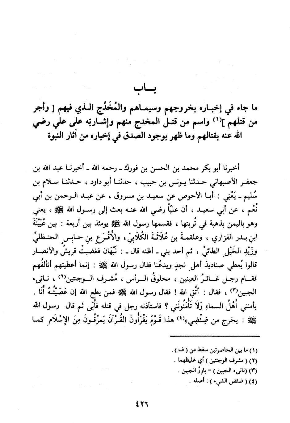 أَخْبَرَنَا أَبُو بَكْرٍ مُحَمَّدُ بْنُ الْحَسَنِ بْنِ فُورَكٍ- رَحِمَهُ اللهُ- أَخْبَرَنَا عَبْدُ اللهِ بْنُ جَعْفَرٍ الْأَصْبَهَانِيُّ حَدَّثَنَا يُونُسُ بْنُ حَبِيبٍ، حَدَّثَنَا أَبُو دَاوُدَ، حَدَّثَنَا سَلَامُ بْنُ سُلَيْمِ- يَعْنِي: أَبَا الْأَحْوَصِ عَنْ سَعِيدِ بْنِ مَسْرُوقِ، عَنْ عَبْدِ الرَّحْمَنِ بْنِ أَبِي نُعْمٍ، عَنْ أَبِي سَعِيدٍ، أَنُّ عَلِيًّا رَضِيَ اللهُ عَنْهُ بَعَثَ إِلَى رَسُولِ اللهِ صَلَّى اللهُ عَلَيْهِ وَسَلَّمَ، يَعْنِي وَهُوَ بِالْيَمَنِ بِذَهَبَةٍ فِي تُرْبَتِهَا، فَقَسَمَهَا رَسُولُ اللهِ صَلَّى اللهُ عَلَيْهِ وَسَلَّمَ يَوْمَئِذٍ بَيْنَ أَرْبَعَةٍ: بَيْنَ عُيَيْنَةَ ابن بَدْرٍ الْفَزَارِيِّ، وَعَلْقَمَةَ بْنِ عُلَاثَةَ الْكِلَابِيِّ، وَالْأَقْرَعُ بْنُ حَابِسٍ الْحَنْظَلِيُّ وَزَيْدِ الْخَيْلِ الطَّائِيِّ، ثُمَّ أَحَدِ بَنِي- أَظُنُّهُ قَالَ-: نَبْهَانَ فَغَضِبَتْ قُرَيْشٌ وَالْأَنْصَارُ قَالُوا يُعْطِي صَنَادِيدَ أَهْلِ نَجْدٍ وَيَدَعُنَا فَقَالَ رَسُولُ اللهِ صَلَّى اللهُ عَلَيْهِ وَسَلَّمَ: إِنَّمَا أَعْطَيْتُهُمْ أَتَأَلَّفُهُمْ فَقَامَ رَجُلٌ غَائِرُ الْعَيْنَيْنِ، مَحْلُوقُ الرَّأْسِ، مُشْرِفُ الْوَجْنَتَيْنِ [ (2) ] ، نَاتِئُ الْجَبِينِ [ (3) ] ، فَقَالَ: اتَّقِ اللهِ! فَقَالَ رَسُولُ اللهِ صَلَّى اللهُ عَلَيْهِ وَسَلَّمَ فَمَنْ يُطِعِ اللهَ إِنْ عَصَيْتُهُ أَنَا.