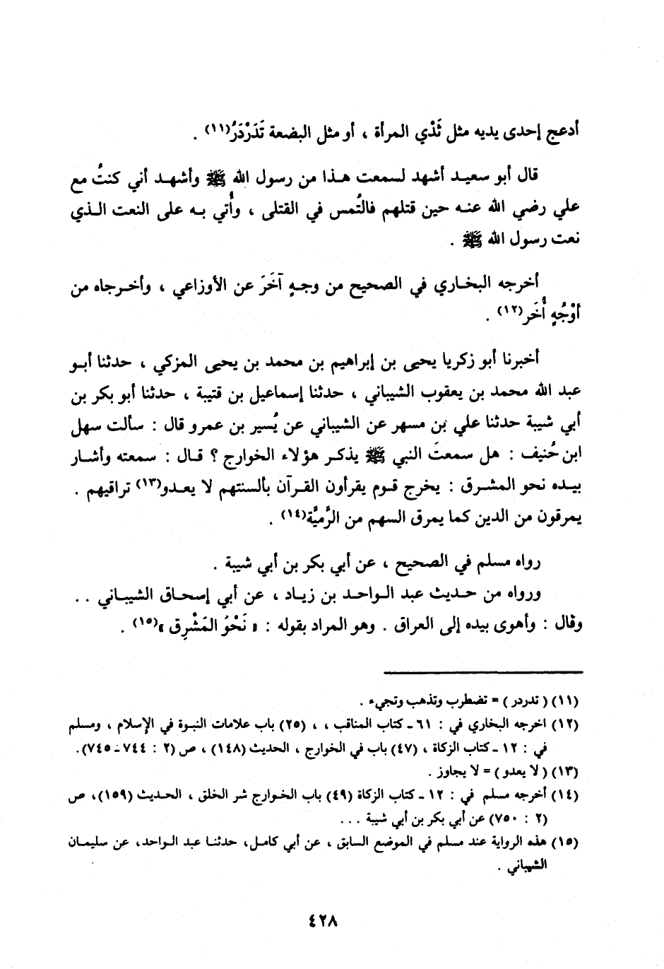 [ (12) ] أخرجه البخاري في: 61- كتاب المناقب، (25) باب علامات النبوة في الإسلام، ومسلم في: 12- كتاب الزكاة، (47) باب في الخوارج، الحديث (148) ، ص (2: 744- 745) .