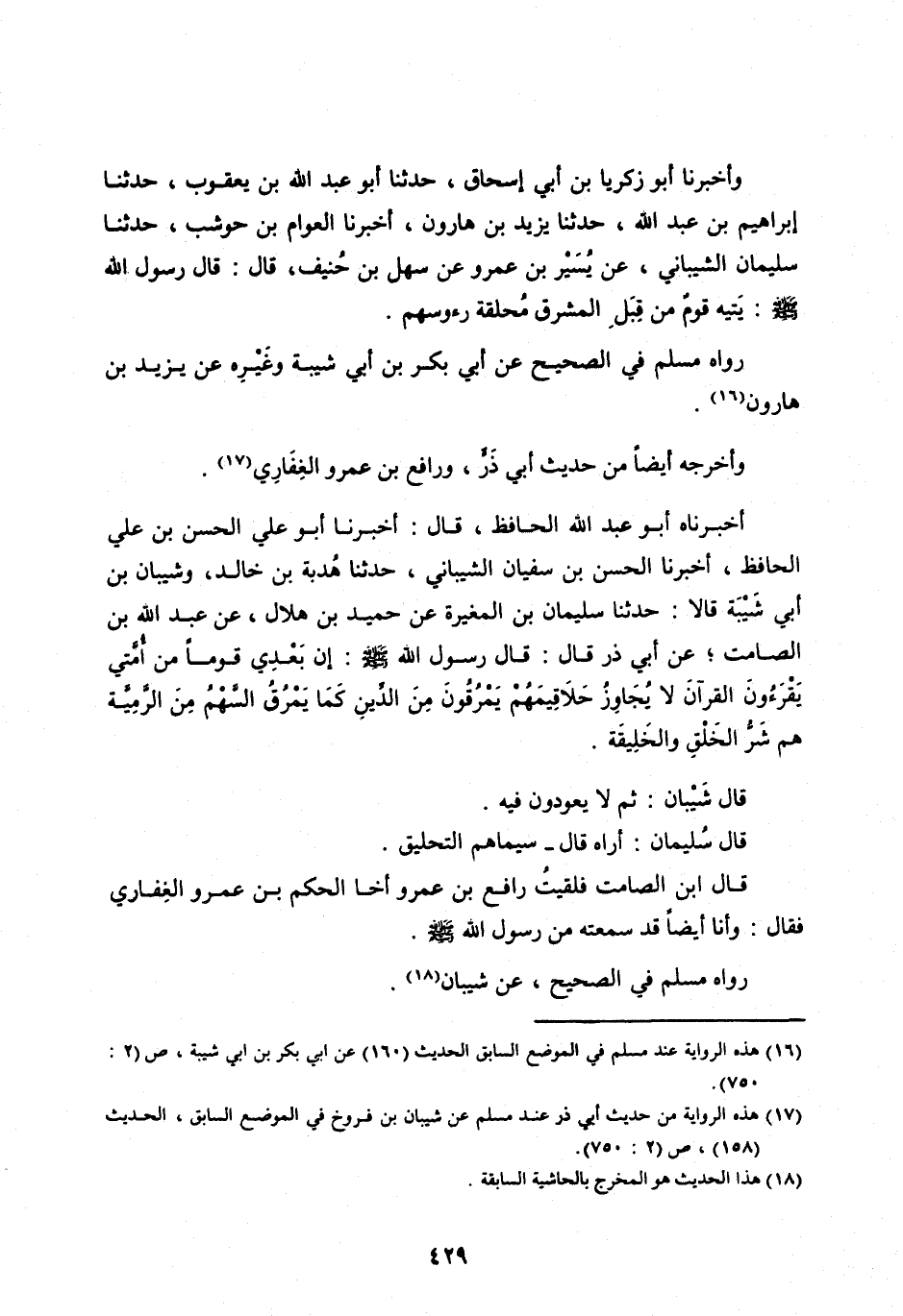 أَخْبَرَنَاهُ أَبُو عَبْدِ اللهِ الْحَافِظُ، قَالَ: أَخْبَرَنَا أَبُو عَلِيٍّ الْحَسَنُ بْنُ عَلِيٍّ الْحَافِظُ، أَخْبَرَنَا الْحَسَنُ بْنُ سُفْيَانَ الشَّيْبَانِيُّ، حَدَّثَنَا هُدْبَةُ بْنُ خَالِدٍ، وَشَيْبَانُ بْنُ أَبِي شَيْبَةَ قَالَا: حَدَّثَنَا سُلَيْمَانُ بْنُ الْمُغِيرَةِ عَنْ حُمَيْدُ بْنُ هِلَالٍ، عَنْ عَبْدِ اللهِ بْنِ الصَّامِتِ، عَنْ أَبِي ذَرٍّ قَالَ: قَالَ رَسُولُ اللهِ صَلَّى اللهُ عَلَيْهِ وسلم: إِنَّ بَعْدِي قَوْمًا مِنْ أُمَّتِي يَقْرَءُونَ الْقُرْآنَ لَا يُجَاوِزُ حَلَاقِيمَهُمْ يَمْرُقُونَ مِنَ الدِّينِ كَمَا يَمْرُقُ السَّهْمُ مِنَ الرَّمِيَّةِ هُمْ شَرُّ الْخَلْقِ وَالْخَلِيقَةِ.