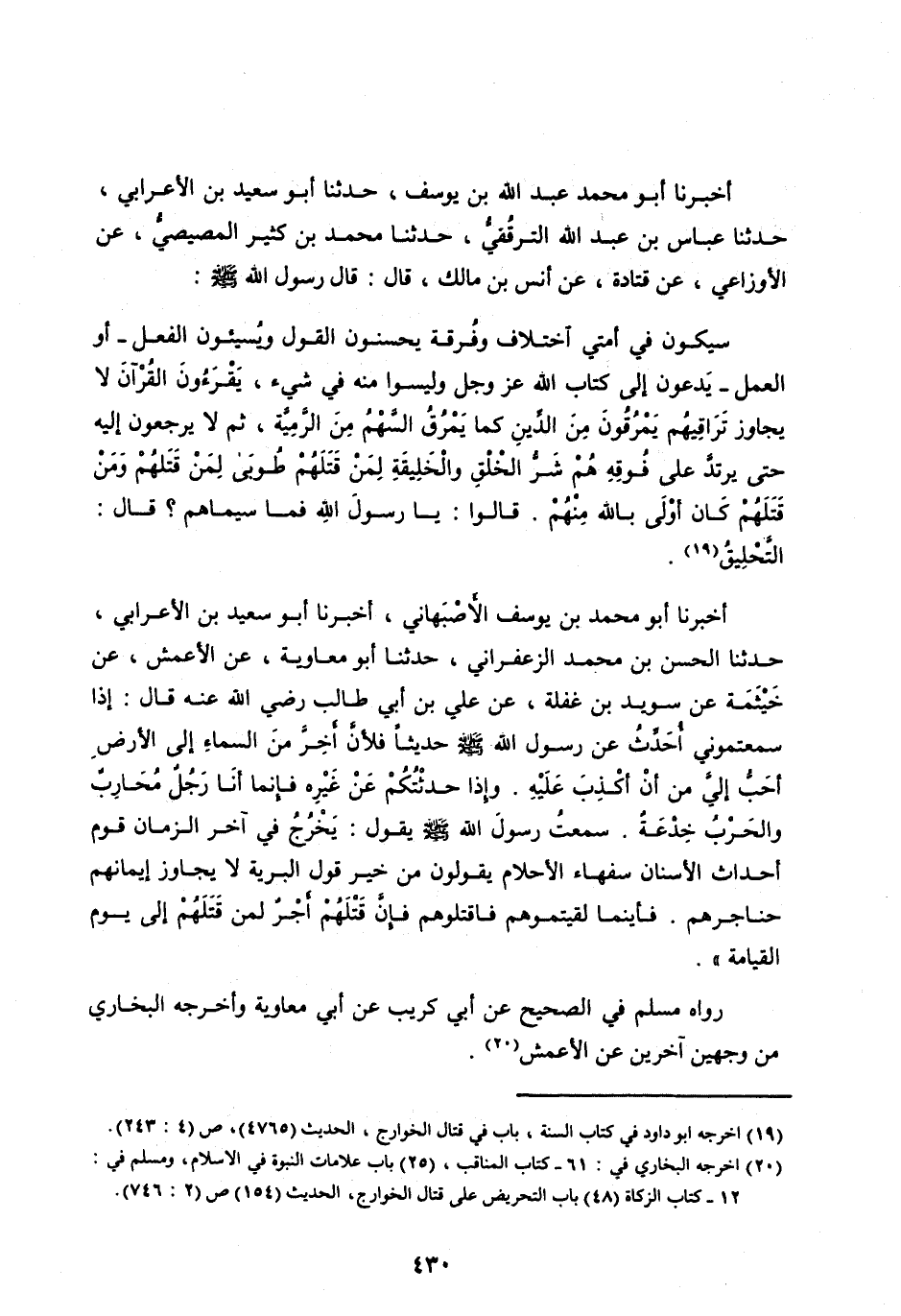 [ (19) ] أخرجه ابو داود في كتاب السنة، باب في قتال الخوارج، الحديث (4765) ، ص (4: 243) .
