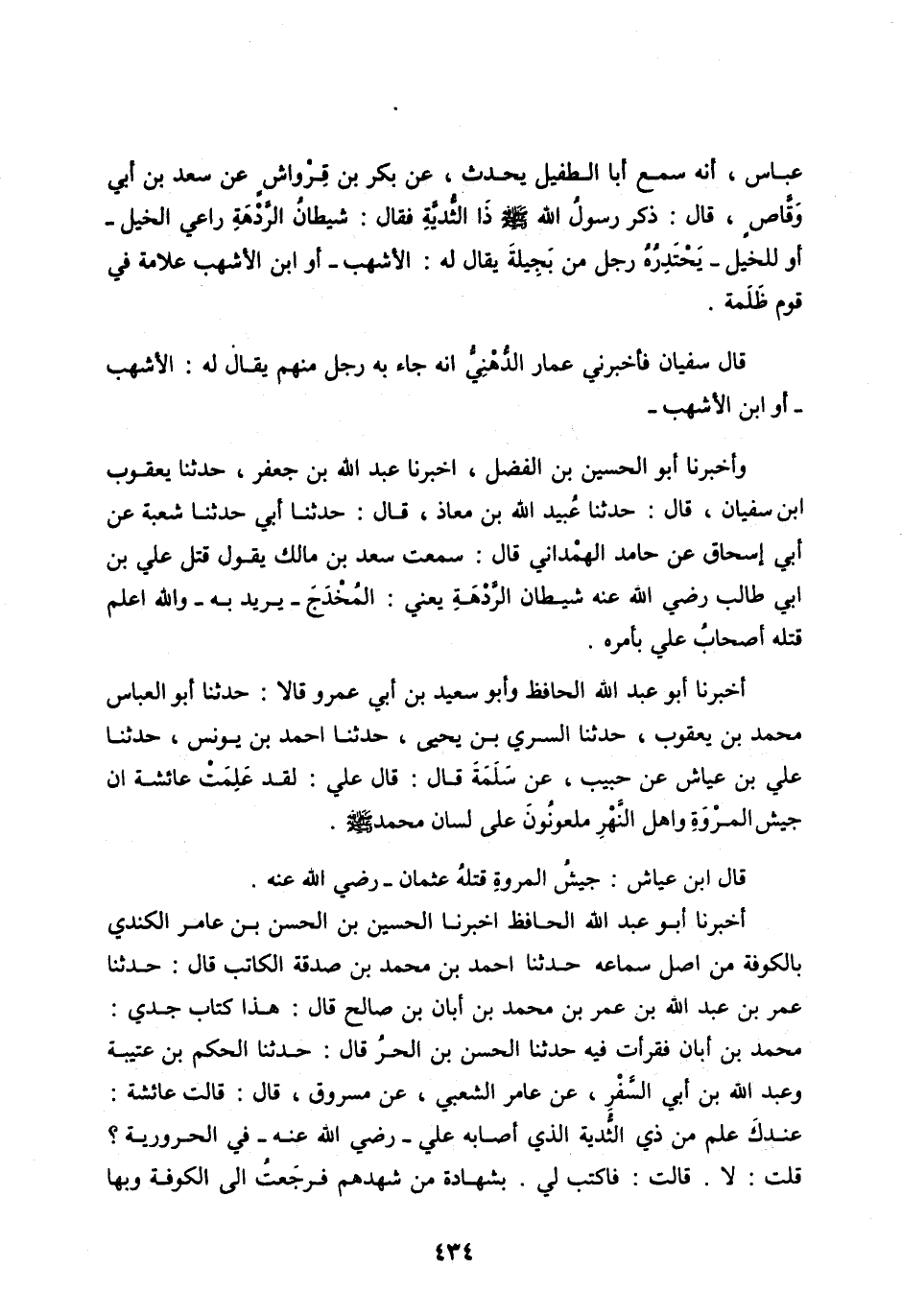 قَالَ سُفْيَانُ فَأَخْبَرَنِي عَمَّارٌ الدُّهْنِيُّ أَنَّهُ جَاءَ بِهِ رَجُلٌ مِنْهُمْ يُقَالُ لَهُ: الْأَشْهَبُ- أَوِ ابْنُ الْأَشْهَبِ- وأَخْبَرَنَا أَبُو الْحُسَيْنِ بْنُ الْفَضْلِ، أَخْبَرَنَا عَبْدُ اللهِ بْنُ جَعْفَرٍ، حَدَّثَنَا يَعْقُوبُ ابْنُ سُفْيَانَ، قَالَ: حَدَّثَنَا عُبَيْدُ اللهِ بْنُ مُعَاذٍ، قَالَ: حَدَّثَنَا أَبِي حَدَّثَنَا شُعْبَةُ عَنْ أَبِي إِسْحَاقَ عَنْ حَامِدٍ الْهَمْدَانِيِّ قَالَ: سَمِعْتُ سَعْدَ بْنَ مَالِكٍ يَقُولُ قَتَلَ عَلِيُّ بْنُ أَبِي طَالِبٍ رَضِيَ اللهُ عَنْهُ شَيْطَانَ الرَّدْهَةِ يَعْنِي: الْمُخْدَجَ- يُرِيدُ بِهِ- وَاللهِ أَعْلَمُ قَتَلَهُ أَصْحَابُ عَلِيٍّ بِأَمْرِهِ.