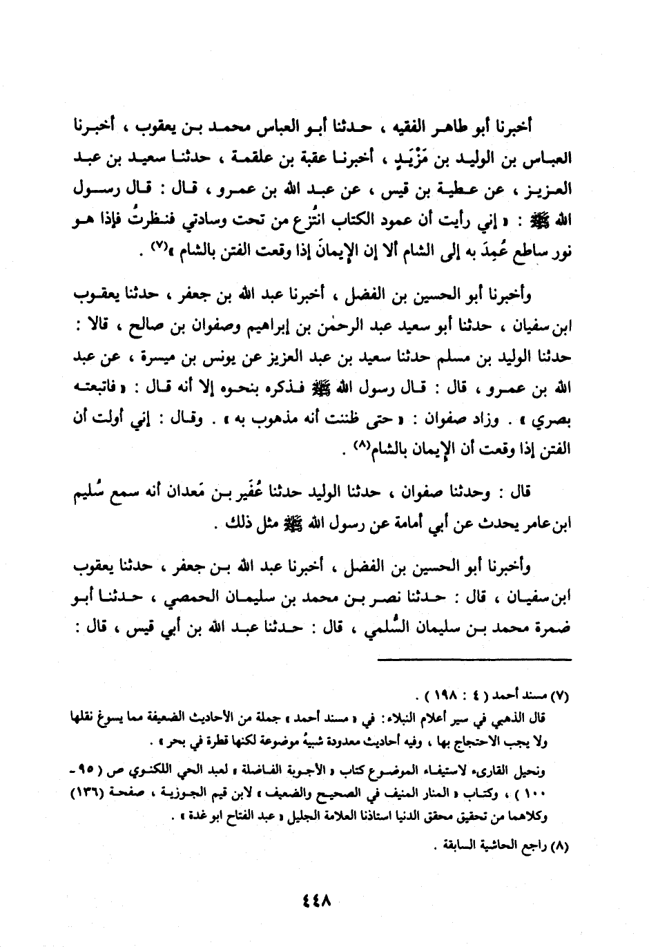 أَخْبَرَنَا أَبُو طَاهِرٍ الْفَقِيهُ، حَدَّثَنَا أَبُو الْعَبَّاسِ مُحَمَّدُ بْنُ يَعْقُوبَ، أَخْبَرَنَا الْعَبَّاسُ بْنُ الْوَلِيدِ بْنِ مَزْيَدَ، أَخْبَرَنَا عُقْبَةُ بْنُ عَلْقَمَةَ، حَدَّثَنَا سَعِيدُ بْنُ عَبْدِ الْعَزِيزِ، عَنْ عَطِيَّةَ بْنِ قَيْسٍ، عَنْ عَبْدِ اللهِ بْنِ عَمْرٍو، قَالَ: قَالَ رَسُولُ اللهِ صَلَّى اللهُ عَلَيْهِ وَسَلَّمَ: «إِنِّي رَأَيْتُ أَنَّ عَمُودَ الْكِتَابِ انْتُزِعَ مِنْ تَحْتِ وِسَادَتِي فَنَظَرْتُ فَإِذَا هُوَ نُورٌ سَاطِعٌ عُمِدَ بِهِ إِلَى الشَّامِ أَلَا إِنَّ الْإِيمَانَ إِذَا وَقَعَتِ الْفِتَنُ بِالشَّامِ» [ (7) ] .