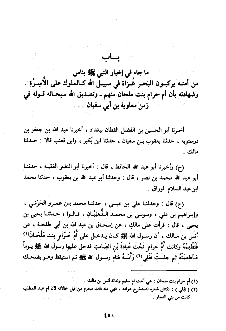 بَابُ مَا جَاءَ فِي إِخْبَارِ النَّبِيِّ صَلَّى اللهُ عَلَيْهِ وَسَلَّمَ بِنَاسٍ مِنْ أُمَّتِهِ يَرْكَبُونَ الْبَحْرَ غُزَاةً فِي سَبِيلِ اللهِ كَالْمُلُوكِ عَلَى الْأَسِرَّةِ. وَشَهَادَتِهِ بِأَنَّ أم حرام بنت ملحان مِنْهُمْ- وَتَصْدِيقِ اللهِ سُبْحَانَهُ قَوْلَهُ فِي زَمَنِ مُعَاوِيَةَ بْنِ أَبِي سُفْيَانَ ...