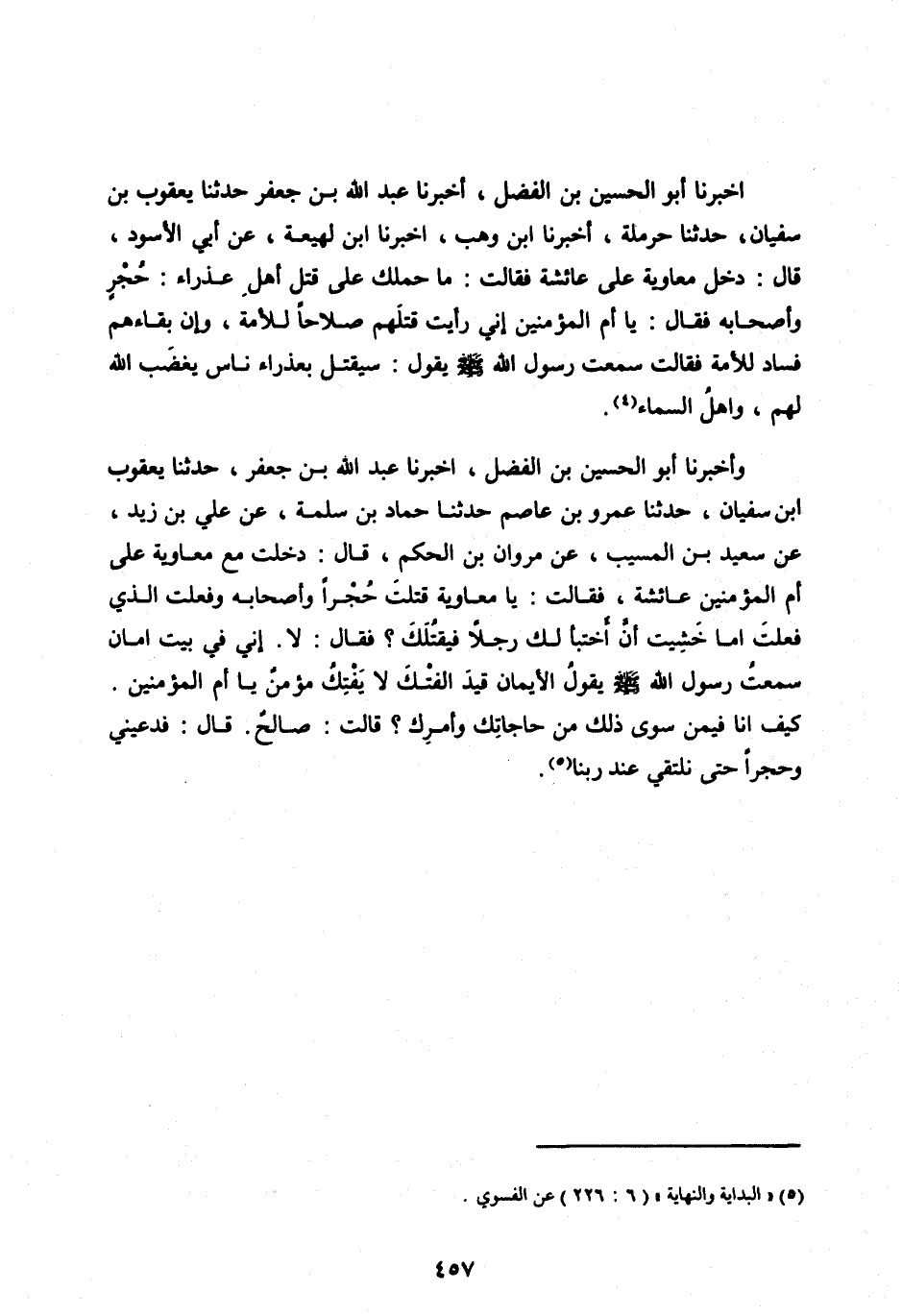 أَخْبَرَنَا أَبُو الْحُسَيْنِ بْنُ الْفَضْلِ، أَخْبَرَنَا عَبْدُ اللهِ بْنُ جَعْفَرٍ حَدَّثَنَا يَعْقُوبُ بْنُ سُفْيَانَ، حَدَّثَنَا حَرْمَلَةُ، أَخْبَرَنَا ابْنُ وَهْبٍ، أَخْبَرَنَا ابْنُ لَهِيعَةَ، عَنْ أَبِي الْأَسْوَدِ، قَالَ: دَخَلَ مُعَاوِيَةُ عَلَى عَائِشَةَ فَقَالَتْ: مَا حَمَلَكَ عَلَى قَتْلِ أَهْلِ عَذْرَاءَ: حُجْرٍ وَأَصْحَابِهِ فَقَالَ: يَا أُمَّ الْمُؤْمِنِينَ إِنِّي رَأَيْتُ قَتْلَهُمْ صَلَاحًا لِلْأُمَّةِ، وَإِنَّ بَقَاءَهُمْ فَسَادٌ لِلْأُمَّةِ فَقَالَتْ سَمِعْتُ رَسُولَ اللهِ صَلَّى اللهُ عَلَيْهِ وَسَلَّمَ يَقُولُ: سَيُقْتَلُ بِعَذْرَاءَ نَاسٌ يَغْضَبُ اللهُ لَهُمْ، وَأَهْلُ السَّمَاءِ [ (4) ] .