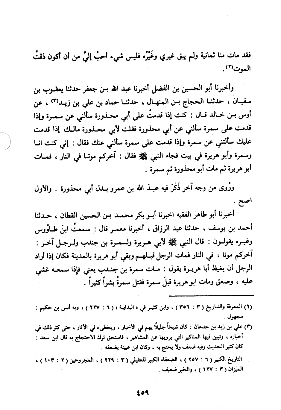 وأَخْبَرَنَا أَبُو الْحُسَيْنِ بْنُ الْفَضْلِ أَخْبَرَنَا عَبْدُ اللهِ بْنُ جَعْفَرٍ حَدَّثَنَا يَعْقُوبُ بْنُ سُفْيَانَ، حَدَّثَنَا الْحَجَّاجُ بْنُ الْمِنْهَالِ، حَدَّثَنَا حماد بْنُ عَلِيِّ بْنِ زَيْدٍ [ (3) ] ، عَنْ أَوْسِ بْنِ خَالِدٍ قَالَ: كُنْتُ إِذَا قَدِمْتُ عَلَى أَبِي مَحْذُورَةَ سَأَلَنِي عَنْ سَمُرَةَ وَإِذَا قَدِمْتُ عَلَى سَمُرَةَ سَأَلَنِي عَنْ أَبِي مَحْذُورَةَ فَقُلْتُ لِأَبِي محذورة مالك إِذَا قَدِمْتُ عَلَيْكَ سَأَلْتَنِي عَنْ سَمُرَةَ وَإِذَا قَدِمْتُ عَلَى سَمُرَةَ سَأَلَنِي عَنْكَ فَقَالَ: إِنِّي كُنْتُ أَنَا وَسَمُرَةُ وَأَبُو هُرَيْرَةَ فِي بَيْتٍ فَجَاءَ النَّبِيُّ صَلَّى اللهُ عَلَيْهِ وَسَلَّمَ فَقَالَ: آخِرُكُمْ مَوْتًا فِي النَّارِ، فَمَاتَ أَبُو هُرَيْرَةَ ثُمَّ مَاتَ أَبُو مَحْذُورَةَ ثُمَّ سَمُرَةُ.