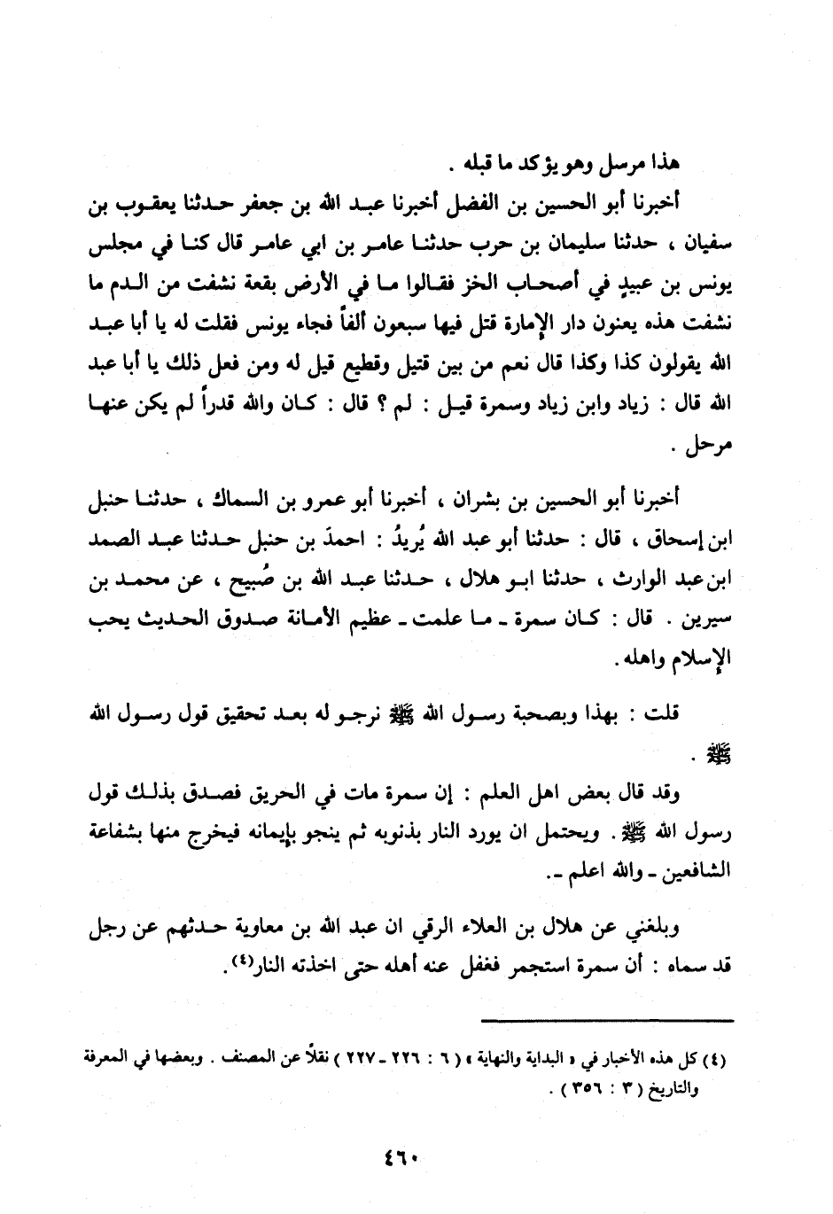 أَخْبَرَنَا أَبُو الْحُسَيْنِ بْنُ بِشْرَانَ، أَخْبَرَنَا أَبُو عَمْرِو بْنُ السَّمَّاكِ، حدثنا حنبل ابْنِ إِسْحَاقَ، قَالَ: حَدَّثَنَا أَبُو عَبْدِ اللهِ يُرِيدُ: أَحْمَدَ بْنَ حَنْبَلٍ حَدَّثَنَا عبد الصمد ابن عَبْدِ الْوَارِثِ، حَدَّثَنَا أَبُو هِلَالٍ، حَدَّثَنَا عَبْدُ اللهِ بْنُ صُبَيْحٍ، عَنْ مُحَمَّدِ بْنِ سِيرِينَ. قَالَ: كَانَ سَمُرَةُ- مَا عَلِمْتُ- عَظِيمَ الْأَمَانَةِ صَدُوقَ الْحَدِيثِ يُحِبُّ الْإِسْلَامَ وَأَهْلَهُ.