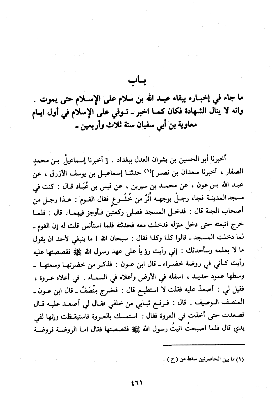 أَخْبَرَنَا أَبُو الْحُسَيْنِ بْنُ بِشْرَانَ الْعَدْلُ بِبَغْدَادَ. [أَخْبَرَنَا إِسْمَاعِيلُ بْنُ مُحَمَّدٍ الصَّفَّارُ، أَخْبَرَنَا سَعْدَانُ بْنُ نَصْرٍ] [ (1) ] حَدَّثَنَا إِسْمَاعِيلُ بْنُ يُوسُفَ الْأَزْرَقُ، عَنْ عَبْدِ اللهِ بْنِ عَوْنٍ، عَنْ مُحَمَّدِ بْنِ سِيرِينَ، عَنْ قَيْسِ بْنِ عُبَادٍ قَالَ: كُنْتُ فِي مَسْجِدِ الْمَدِينَةِ فَجَاءَ رَجُلٌ بِوَجْهِهِ أَثَرٌ مِنْ خُشُوعٍ فَقَالَ الْقَوْمُ: هَذَا رَجُلٌ مِنْ أَصْحَابِ الْجَنَّةِ قَالَ: فَدَخَلَ الْمَسْجِدَ فَصَلَّى رَكْعَتَيْنِ فَأَوْجَزَ فِيهِمَا. قَالَ: فَلَمَّا خَرَجَ اتَّبَعْتُهُ حَتَّى دَخَلَ مَنْزِلَهُ فَدَخَلْتُ مَعَهُ فَحَدَّثْتُهُ فَلَمَّا اسْتَأْنَسَ قُلْتُ لَهُ إِنَّ الْقَوْمَ- لَمَّا دَخَلْتَ الْمَسْجِدَ- قَالُوا كَذَا وَكَذَا فَقَالَ: سُبْحَانَ اللهِ! مَا يَنْبَغِي لِأَحَدٍ أَنْ يَقُولَ مَا لَا يَعْلَمُهُ وَسَأُحَدِّثُكَ: إِنِّي رَأَيْتُ رُؤْيَا عَلَى عَهْدِ رَسُولِ اللهِ صَلَّى اللهُ عَلَيْهِ وَسَلَّمَ فَقَصَصْتُهَا عَلَيْهِ رَأَيْتُ كَأَنِّيَ فِي رَوْضَةٍ خَضْرَاءَ- قَالَ ابْنُ عَوْنٍ: فَذَكَرَ مِنْ خُضْرَتِهَا وَسَعَتِهَا- وَسَطَهَا عَمُودُ حَدِيدٍ، أَسْفَلَهُ فِي الْأَرْضِ وَأَعْلَاهُ فِي السَّمَاءِ. فِي أَعْلَاهُ عُرْوَةٌ، فَقِيلَ لِيَ: اصْعَدْ عَلَيْهِ فَقُلْتُ لَا أَسْتَطِيعُ قَالَ: فَخَرَجَ مِنْصَفٌ- قَالَ ابْنُ عَوْنٍ- الْمِنْصَفُ الْوَصِيفُ. قَالَ: فَرَفَعَ ثِيَابِي مِنْ خَلْفِي فَقَالَ لِيَ اصْعَدْ عَلَيْهِ قَالَ فَصَعِدْتُ حَتَّى أَخَذْتُ فِي الْعُرْوَةِ فَقَالَ: اسْتَمْسِكْ بِالْعُرْوَةِ فَاسْتَيْقَظْتُ وَإِنَّهَا لَفِي يَدَيَّ قَالَ فَلَمَّا أَصْبَحْتُ أَتَيْتُ رَسُولَ اللهِ صَلَّى اللهُ عَلَيْهِ وَسَلَّمَ فَقَصَصْتُهَا فَقَالَ أَمَّا الرَّوْضَةُ فَرَوْضَةُ