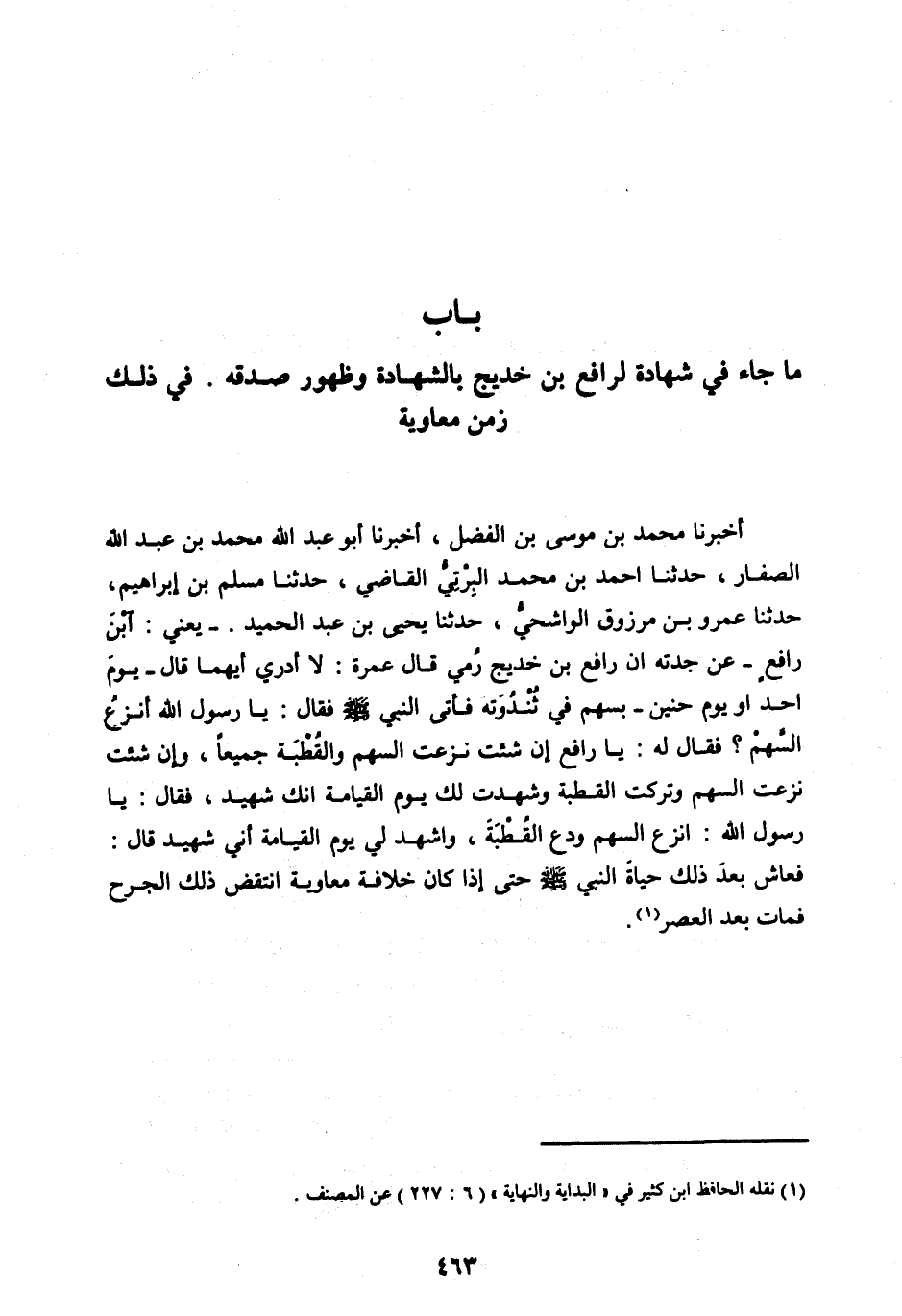 بَابُ مَا جَاءَ فِي شَهَادَةٍ لِرَافِعِ بْنِ خَدِيجٍ بِالشَّهَادَةِ وَظُهُورِ صِدْقِهِ. فِي ذَلِكَ زَمَنَ مُعَاوِيَةَ