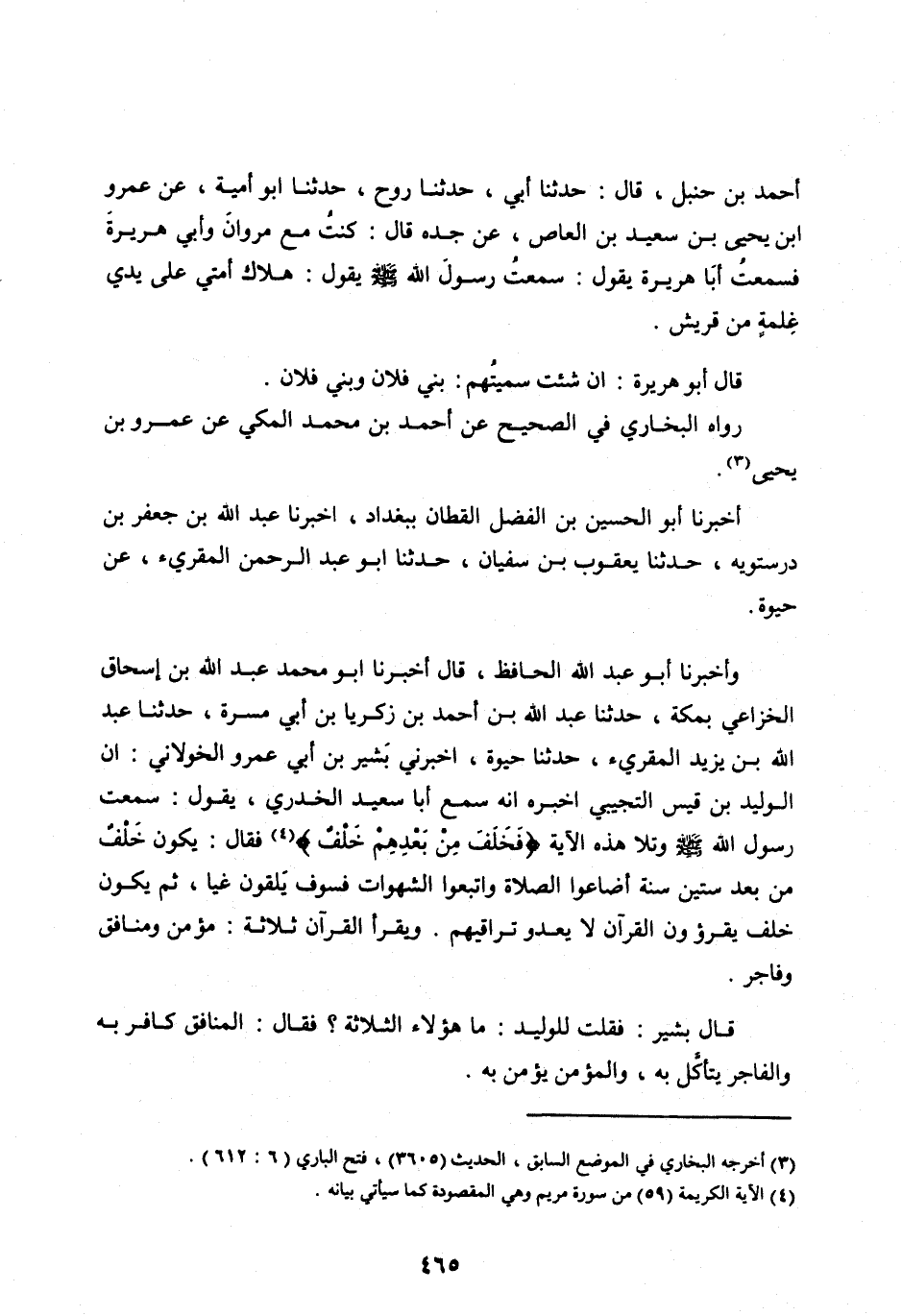 أَحْمَدَ بْنِ حَنْبَلٍ، قَالَ: حَدَّثَنَا أَبِي، حَدَّثَنَا رَوْحٌ، حَدَّثَنَا أَبُو أُمَيَّةَ، عَنْ عمرو ابْنُ يَحْيَى بْنِ سَعِيدِ بْنِ الْعَاصِ، عَنْ جَدِّهِ قَالَ: كُنْتُ مَعَ مَرْوَانَ وَأَبِي هُرَيْرَةَ فَسَمِعْتُ أَبَا هُرَيْرَةَ يَقُولُ: سَمِعْتُ رَسُولَ اللهِ صَلَّى اللهُ عَلَيْهِ وَسَلَّمَ يَقُولُ: هَلَاكُ أُمَّتِي عَلَى يَدَيْ غِلْمَةٍ مِنْ قُرَيْشٍ.