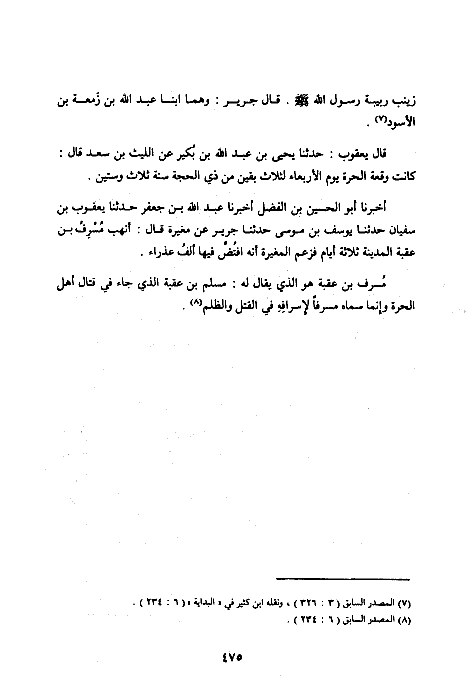 أَخْبَرَنَا أَبُو الْحُسَيْنِ بْنُ الْفَضْلِ أَخْبَرَنَا عَبْدُ اللهِ بْنُ جَعْفَرٍ حَدَّثَنَا يَعْقُوبُ بْنُ سُفْيَانَ حَدَّثَنَا يُوسُفُ بْنُ مُوسَى حَدَّثَنَا جَرِيرٌ عَنْ مُغِيرَةَ قَالَ: أَنْهَبَ مُسْرِفُ بْنُ عُقْبَةَ الْمَدِينَةَ ثَلَاثَةَ أَيَّامٍ فَزَعَمَ الْمُغِيرَةُ أَنَّهُ افْتُضَّ فِيهَا أَلْفُ عَذْرَاءَ.