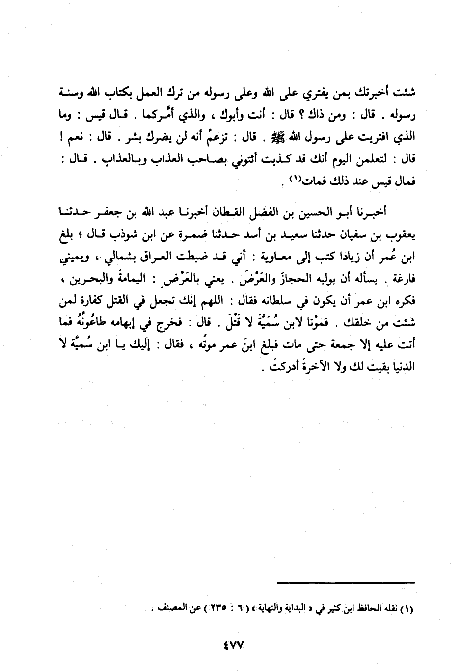 شِئْتَ أَخْبَرْتُكَ بِمَنْ يَفْتَرِي عَلَى اللهِ وَعَلَى رَسُولِهِ مَنْ تَرَكَ الْعَمَلَ بِكِتَابِ اللهِ وَسُنَّةِ رَسُولِهِ. قَالَ: وَمَنْ ذَاكَ؟ قَالَ: أَنْتَ وَأَبُوكَ، وَالَّذِي أَمَّرَكُمَا. قَالَ قَيْسٌ: وَمَا الَّذِي افْتَرَيْتُ عَلَى رَسُولِ اللهِ صَلَّى اللهُ عَلَيْهِ وَسَلَّمَ. قَالَ: تَزْعُمُ أَنَّهُ لَنْ يَضُرَّكَ بَشَرٌ. قَالَ: نَعَمْ! قَالَ: لَتَعْلَمَنَّ الْيَوْمَ أَنَّكَ قَدْ كَذَبْتَ ائْتُونِي بِصَاحِبِ الْعَذَابِ وَبِالْعَذَابِ. قَالَ: