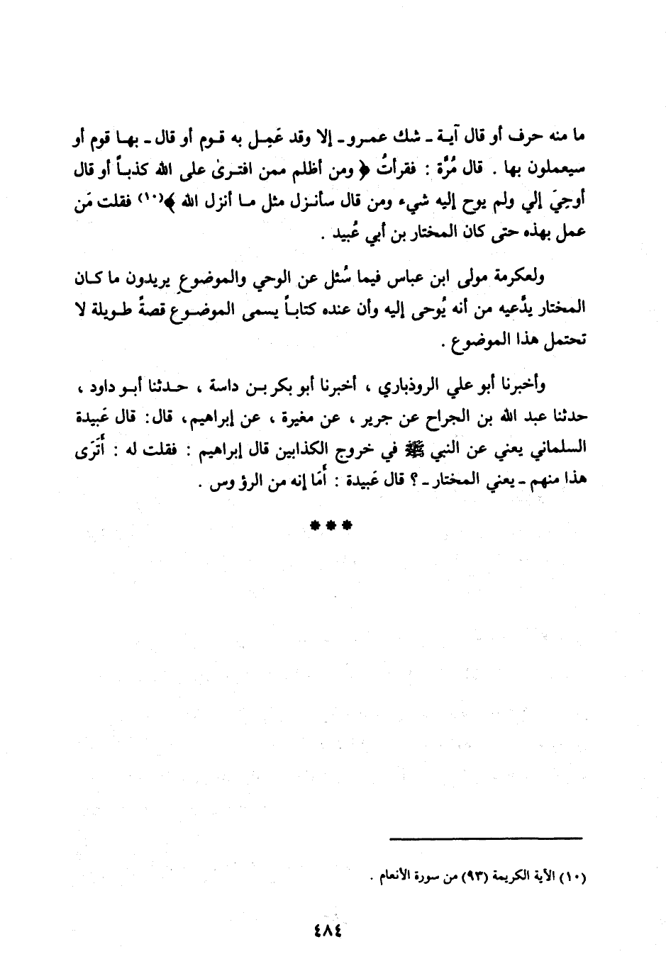 وأَخْبَرَنَا أَبُو عَلِيٍّ الرُّوذْبَارِيُّ، أَخْبَرَنَا أَبُو بَكْرِ بْنُ دَاسَةَ، حَدَّثَنَا أَبُو دَاوُدَ، حَدَّثَنَا عَبْدُ اللهِ بْنُ الْجَرَّاحِ عَنْ جَرِيرٍ، عَنْ مُغِيرَةَ، عَنْ إِبْرَاهِيمَ، قَالَ: قَالَ عَبِيدَةُ السَّلْمَانِيُّ يَعْنِي عَنِ النَّبِيِّ صَلَّى اللهُ عليه وَسَلَّمَ فِي خُرُوجِ الْكَذَّابَيْنِ قَالَ إِبْرَاهِيمُ: فَقُلْتُ لَهُ: أَتَرَى هَذَا مِنْهُمْ- يَعْنِي الْمُخْتَارَ-؟ قَالَ عَبِيدَةُ: أَمَا إنه من الرؤوس.