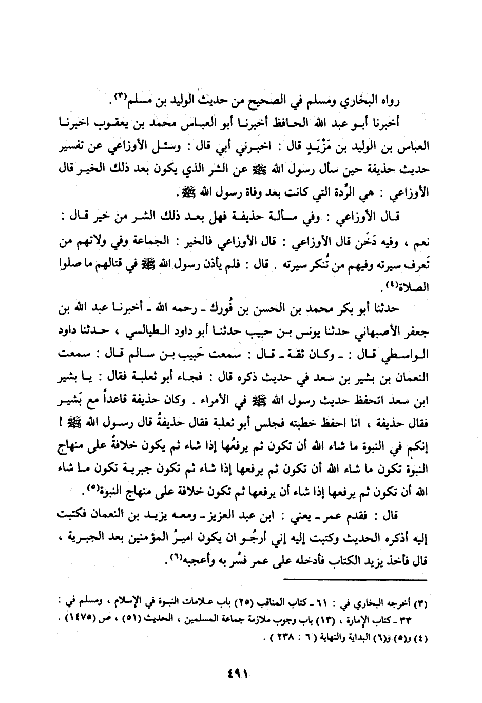 أَخْبَرَنَا أَبُو عَبْدِ اللهِ الْحَافِظُ أَخْبَرَنَا أَبُو الْعَبَّاسِ مُحَمَّدُ بْنُ يَعْقُوبَ أَخْبَرَنَا الْعَبَّاسُ بْنُ الْوَلِيدِ بن مزيد قال: أَخْبَرَنِي أَبِي قَالَ: وَسُئِلَ الْأَوْزَاعِيُّ عَنْ تَفْسِيرِ حَدِيثِ حُذَيْفَةَ حِينَ سَأَلَ رَسُولَ اللهِ صَلَّى الله عليه وَسَلَّمَ عَنِ الشَّرِّ الَّذِي يَكُونُ بَعْدَ ذَلِكَ الْخَيْرِ قَالَ الْأَوْزَاعِيُّ: هِيَ الرِّدَّةُ الَّتِي كَانَتْ بَعْدَ وَفَاةِ رسول الله صلى الله عَلَيْهِ وَسَلَّمَ.
