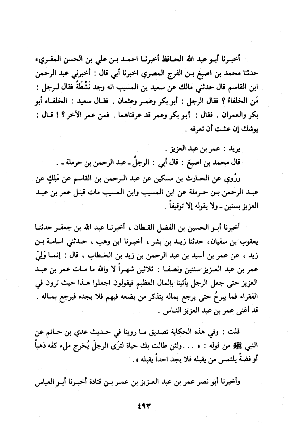 أَخْبَرَنَا أَبُو الْحُسَيْنِ بْنُ الْفَضْلِ الْقَطَّانُ، أَخْبَرَنَا عَبْدُ اللهِ بْنُ جَعْفَرٍ حَدَّثَنَا يَعْقُوبُ بْنُ سُفْيَانَ، حَدَّثَنَا زَيْدُ بْنُ بِشْرٍ، أَخْبَرَنَا ابْنُ وَهْبٍ، حَدَّثَنِي أُسَامَةُ بْنُ زَيْدٍ، عَنْ عُمَرَ بْنِ أُسَيْدِ بْنِ عَبْدِ الرَّحْمَنِ بْنِ زَيْدِ بْنِ الْخَطَّابِ، قَالَ: إِنَّمَا وَلِيَ عُمَرُ بْنُ عَبْدِ الْعَزِيزِ سَنَتَيْنِ وَنِصْفًا: ثَلَاثِينَ شَهْرًا لَا وَاللهِ مَا مَاتَ عُمَرُ بْنُ عَبْدِ الْعَزِيزِ حَتَّى جَعَلَ الرَّجُلُ يَأْتِينَا بِالْمَالِ الْعَظِيمِ فَيَقُولُونَ اجْعَلُوا هَذَا حَيْثُ تَرَوْنَ فِي الْفُقَرَاءِ فَمَا يَبْرَحُ حَتَّى يَرْجِعَ بِمَالِهِ يَتَذَكَّرُ مَنْ يَضَعُهُ فِيهِمْ فَلَا يَجِدُهُ فَيَرْجِعُ بِمَالِهِ.