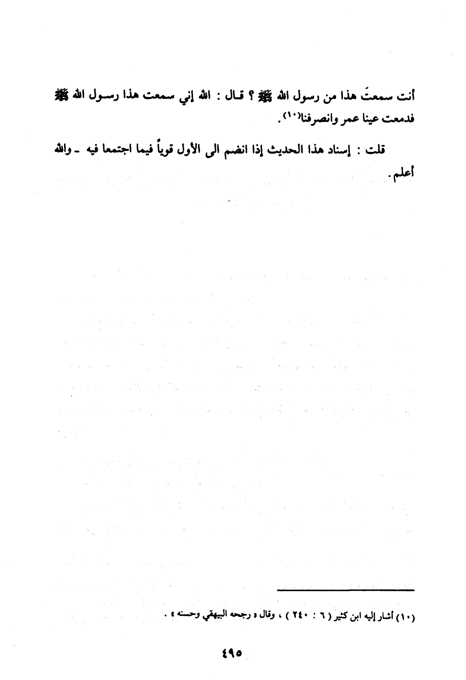 أَنْتَ سَمِعْتَ هَذَا مِنْ رَسُولِ اللهِ صَلَّى اللهُ عَلَيْهِ وَسَلَّمَ؟ قَالَ: اللهِ إني سمعت هَذَا رَسُولُ اللهِ صَلَّى الله عَلَيْهِ وَسَلَّمَ فَدَمَعَتْ عَيْنَا عُمَرُ وَانْصَرَفْنَا [ (10) ] .