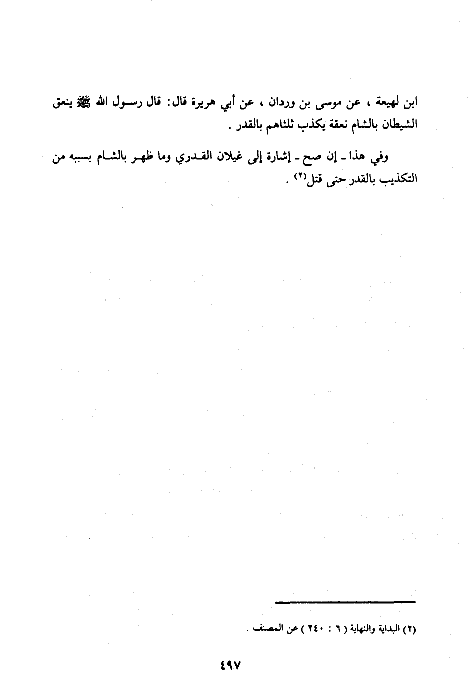 ابْنُ لَهِيعَةَ، عَنْ مُوسَى بْنِ وَرْدَانَ، عَنْ أَبِي هُرَيْرَةَ قَالَ: قَالَ رَسُولُ اللهِ صَلَّى الله عليه وَسَلَّمَ يَنْعِقُ الشَّيْطَانُ بِالشَّامِ نَعْقَةً يُكَذِّبُ ثُلُثَاهُمْ بِالْقَدَرِ.