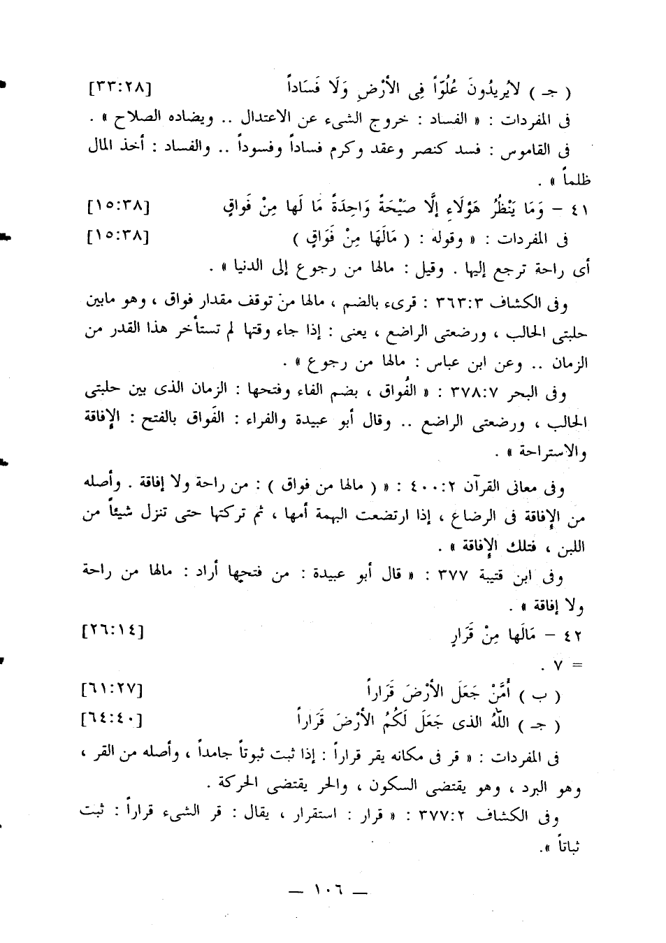 في البحر 514:6: (القوام: الاعتدال بين الحالتين، وقرأ حسان بن عب الرحمن: (قواما) بالكسر، فقيل: هما لغتان بمعنى واحد، وقيل: بالكسر: ما يقام به الشيء، وقيل: مبلغًا وسدادًا)