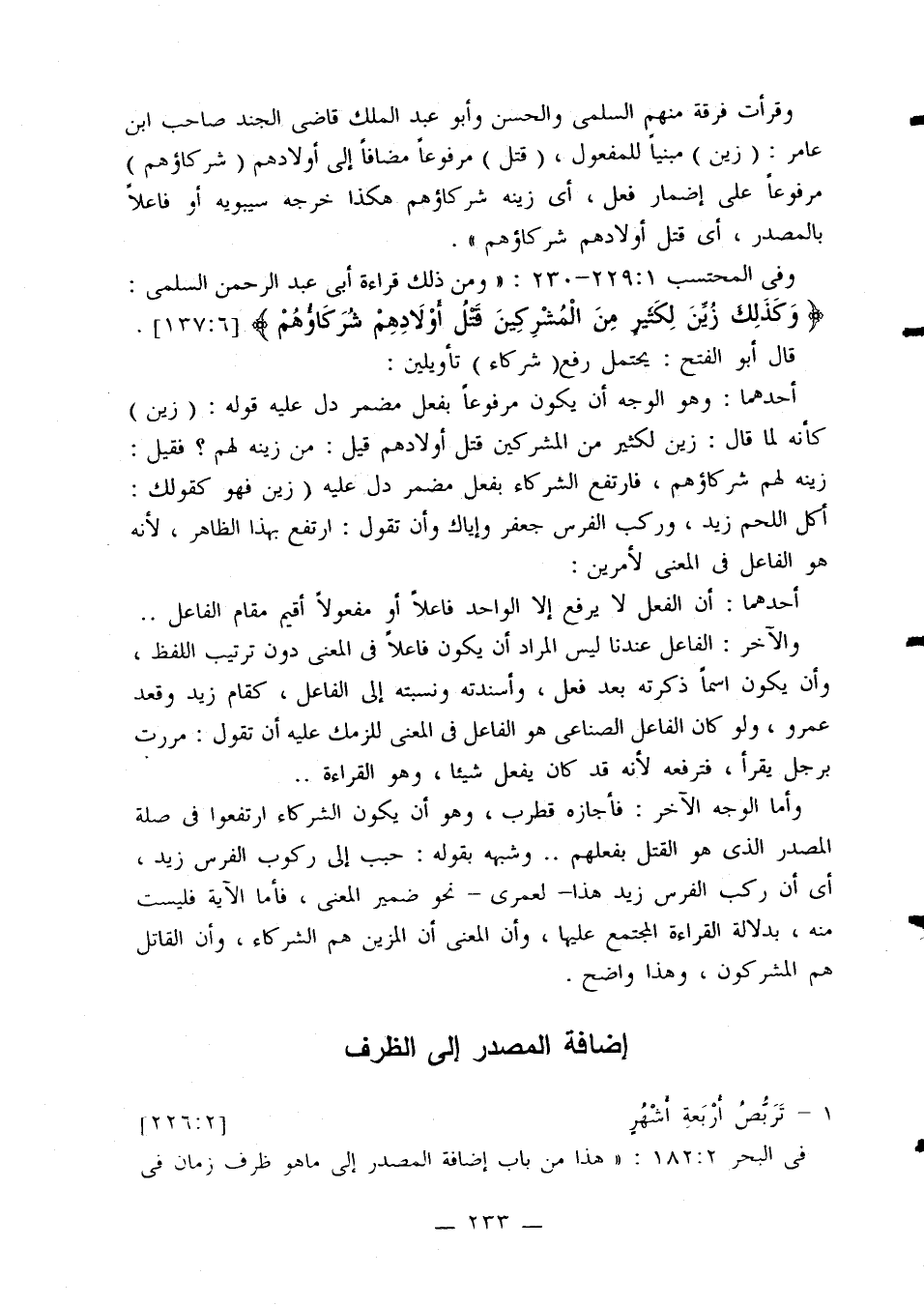 ولا يجيز جلة النحويين الإضافة إلى الظرف، لأن الظرف على تقدير (في) والإضافة عندهم على تقدير اللام أو تقدير (من). . . فإن اتسع في العامل جاز أن ينصب الظرف نصب المفعول به، وجاز إذ ذاك أن يضاف مصدره إلى ذلك الظرف المتسع في عامله، وأجاز بعض النحويين أن تكون الإضافة على تقدير (في) وهو مذهب مردود).