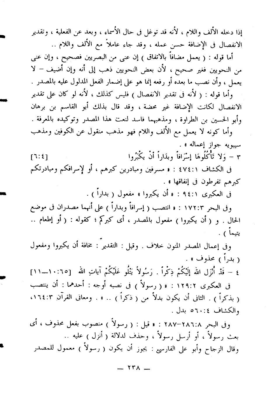 وفي البحر 220:3 - 221: (أن ينكح) أجازوا فيه أن يكون أصله بحرف جر: فمنهم من قدره بإلى أو باللام. . وأجازوا فيه أن يكون (أن ينكح) في موضع نصب على المفعول به، وناصبه (طولاً)؛ إذ جعلوه مصدر طلت الشيء، أي نلته، وقد يكون قد عمل المصدر المنون في المفعول به. .).