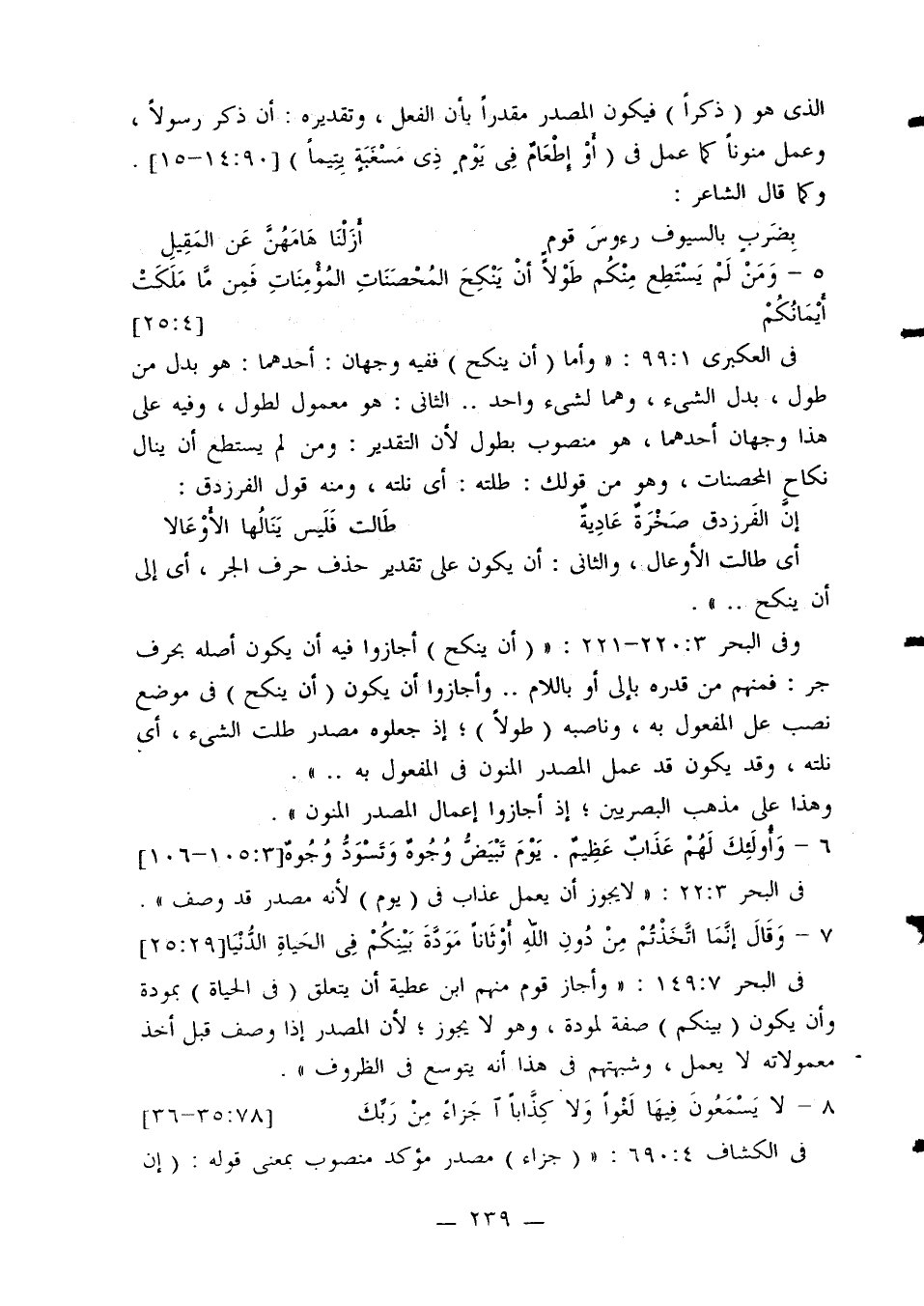 وفي البحر 415:8: (وهذا لا يجوز لأنه جعله مصدراً مؤكداً لمضمون الجملة التي هي: (إن للمتقين مفازاً) [31:78]. والمصدر المؤكد لا يعمل، لأنه ليس ينحل بحرف مصدري والفعل، ولا نعلم في ذلك خلافاً).