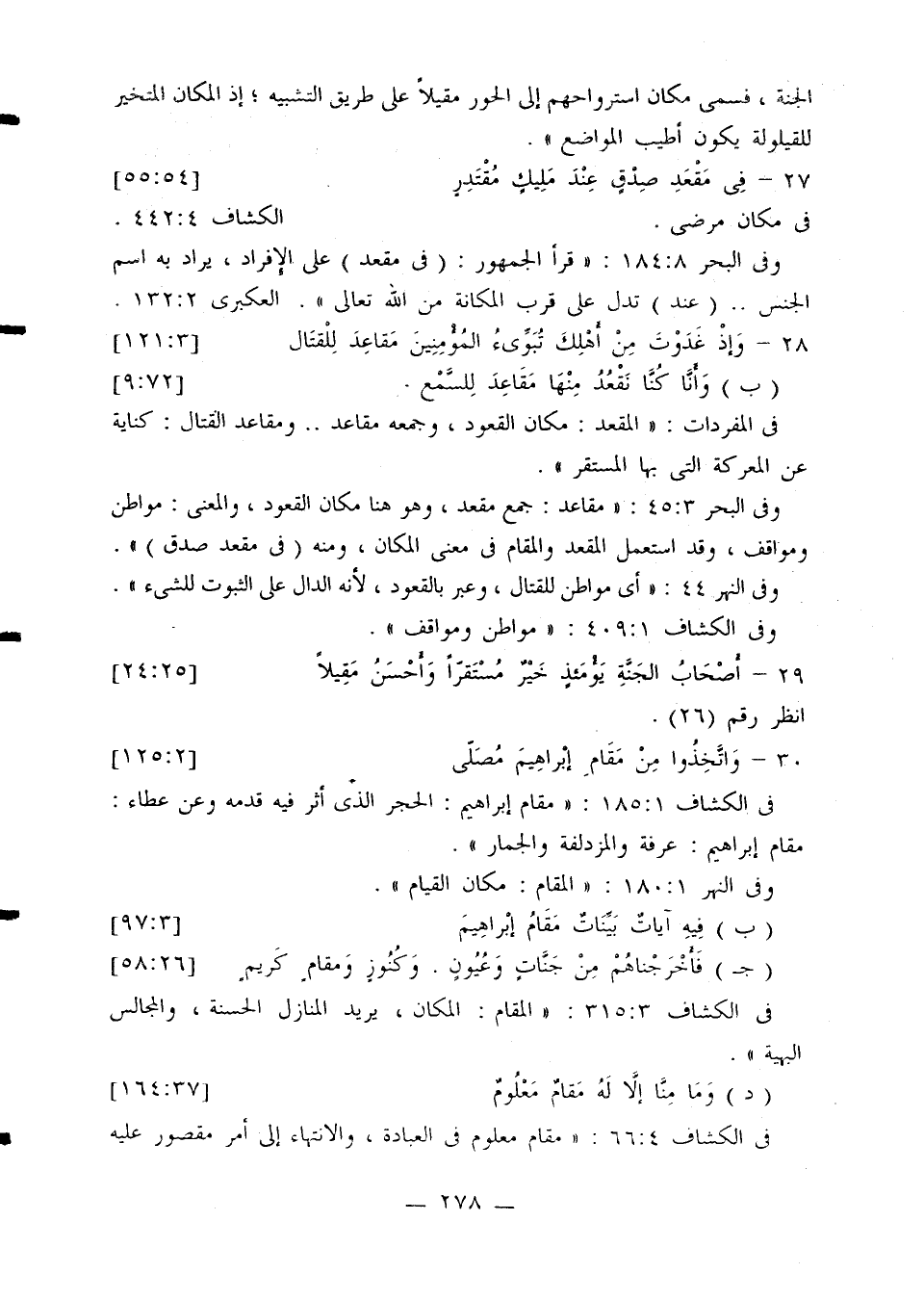 وقال في ص 44: (والمقام، بفتح الميم أجود في العربية لأنه المكان (يريد في مقامٍ أمين). النشر 371:2، البحر 40:8، الكشاف 282:4.