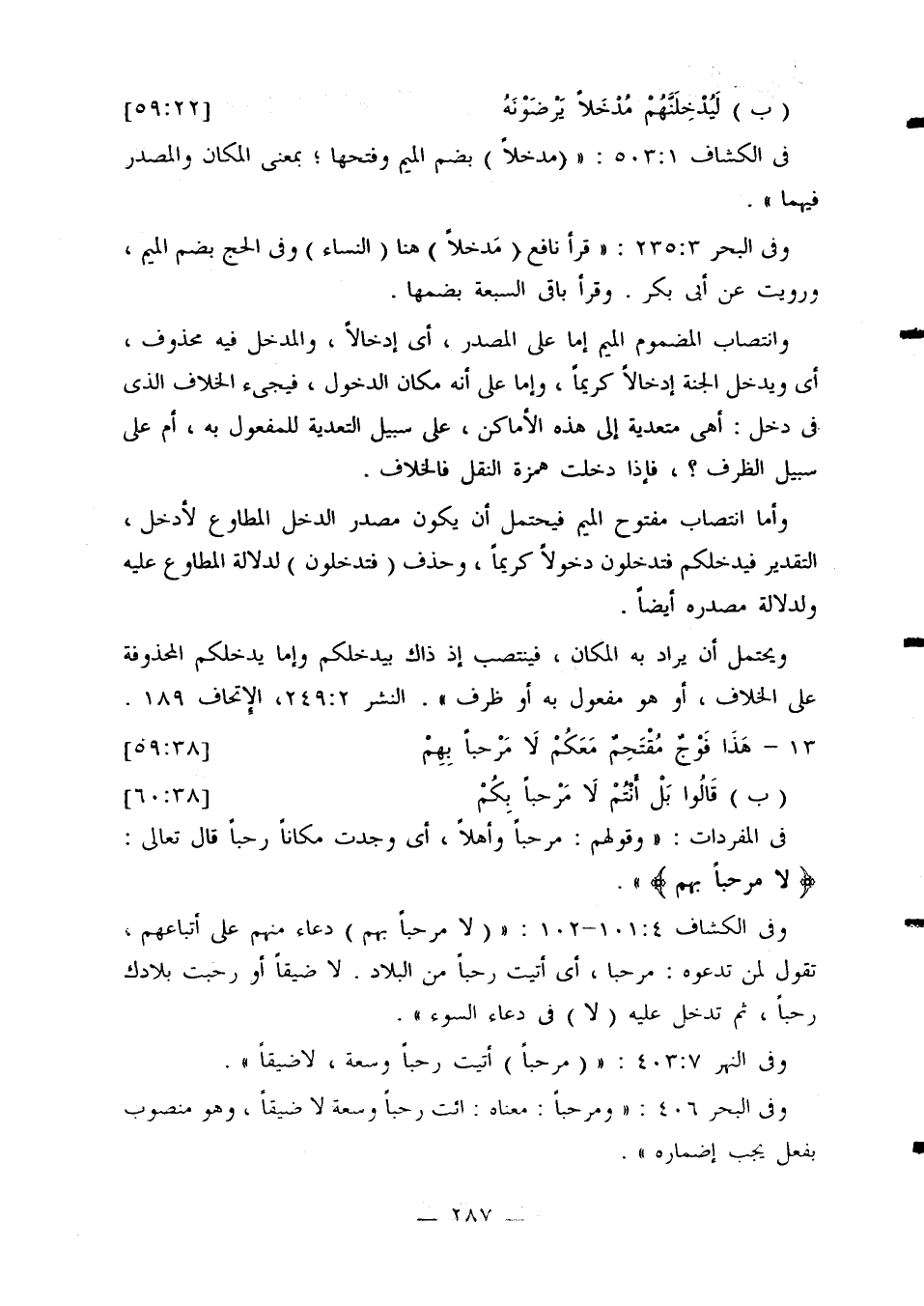 وفي العكبري 2: 111: «(لا مرحبًا) مرحبًا. منصوب على المصدر، أو على المفعول به، أي لا يسمعون مرحبًا».
